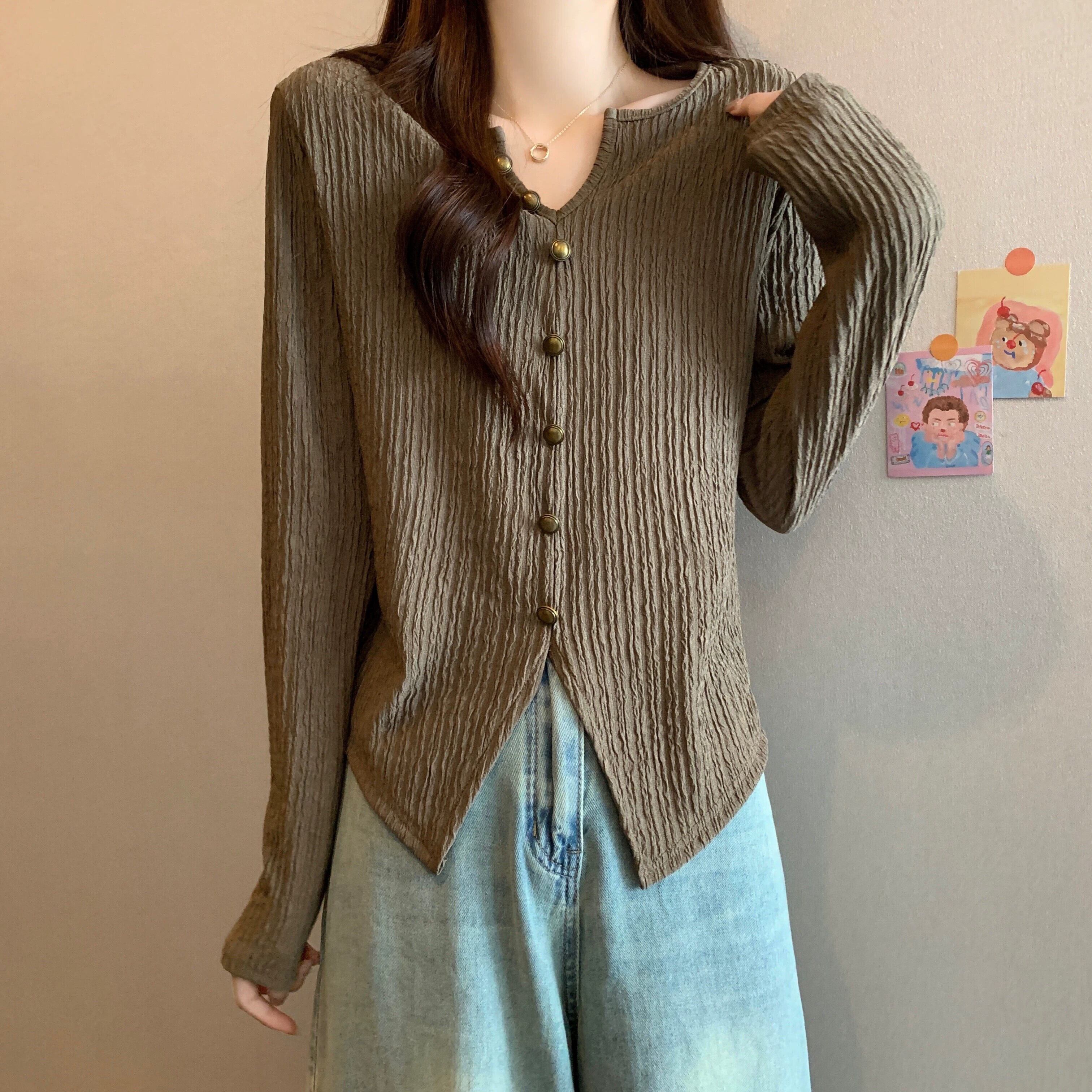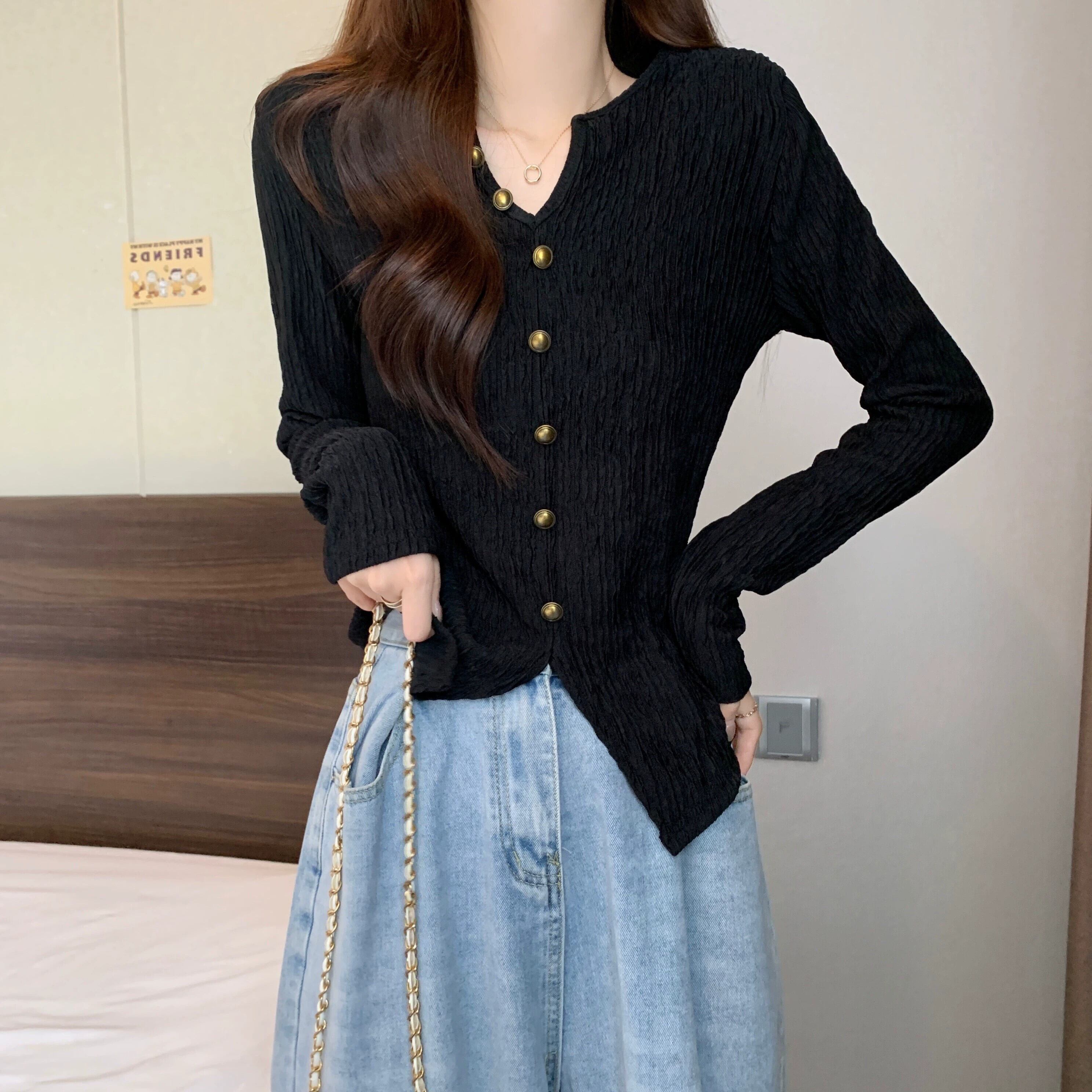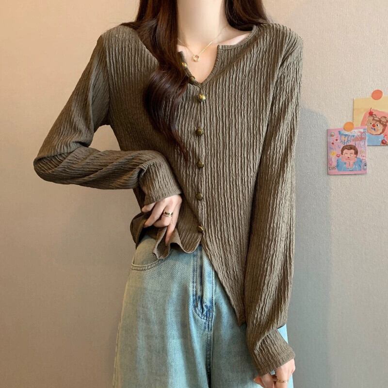 レトロな V ネックのプリーツ ニット ボトム シャツの春の女性、太った mm、痩身、西洋風のインナー、小さな香りのスタイルの不規則なトップ スプリング 春物 Vネック 8884177844901337
