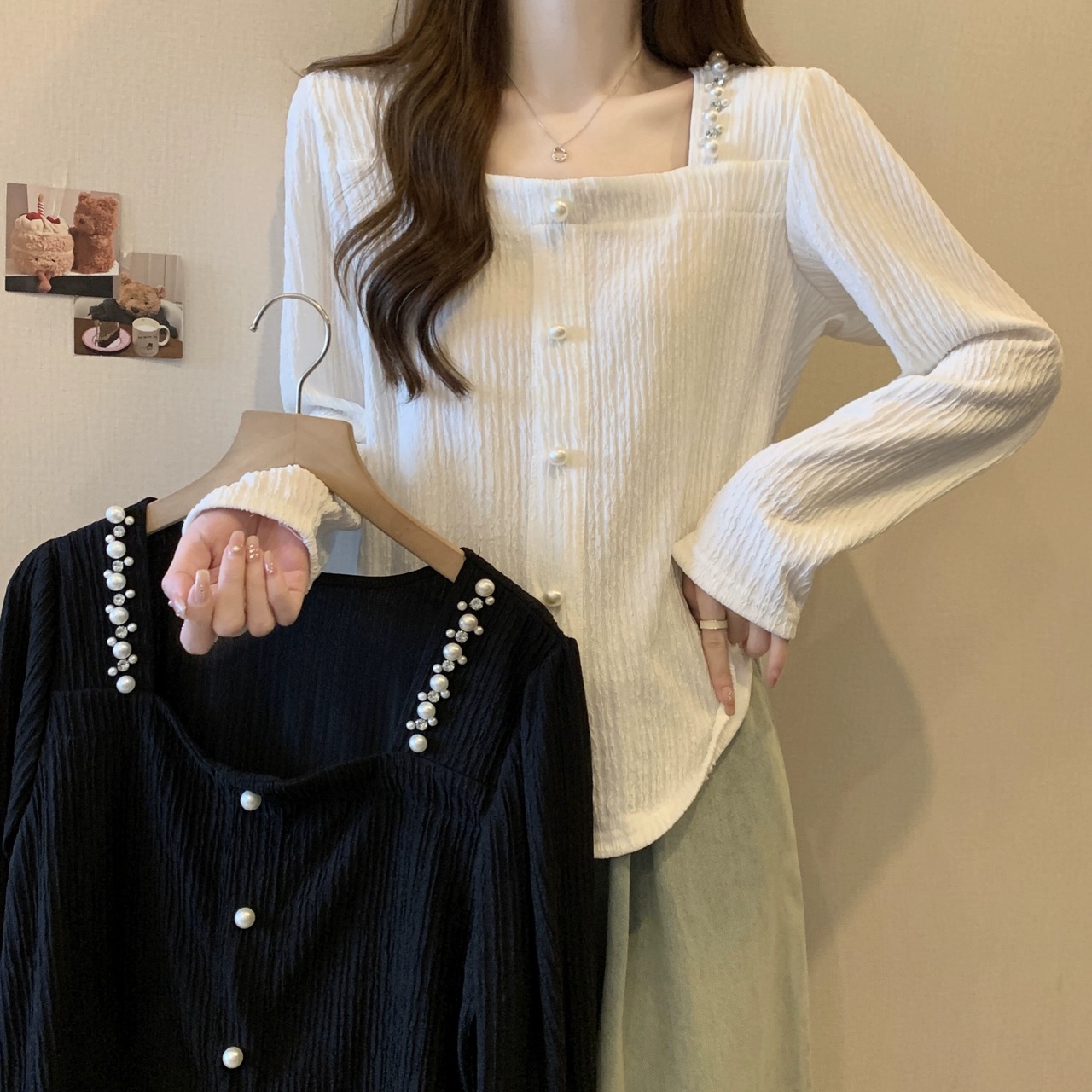 プラスサイズの女性の脂肪ミリメートル春の新しいスタイル 2024 デザインスクエアネックビーズ Tシャツ右肩長袖腹カバートップ ロング 大きめサイズ スプリング 春物 スクウェア 8884156503462335