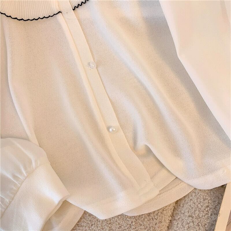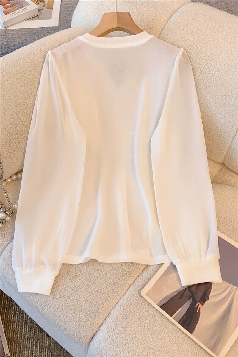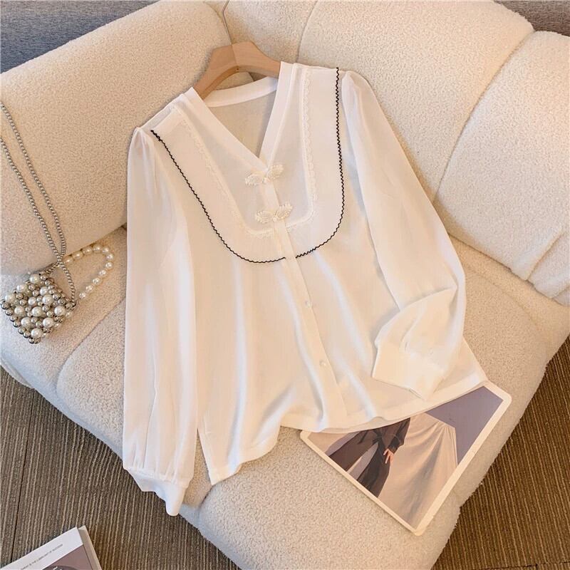 中国風中国風ボタンダウン白シャツ女性春プラスサイズ脂肪ミリメートル痩身 V ネックシフォンシャツフリルトップ ホワイト 大きめサイズ スプリング 春物 Vネック 8884173966074457