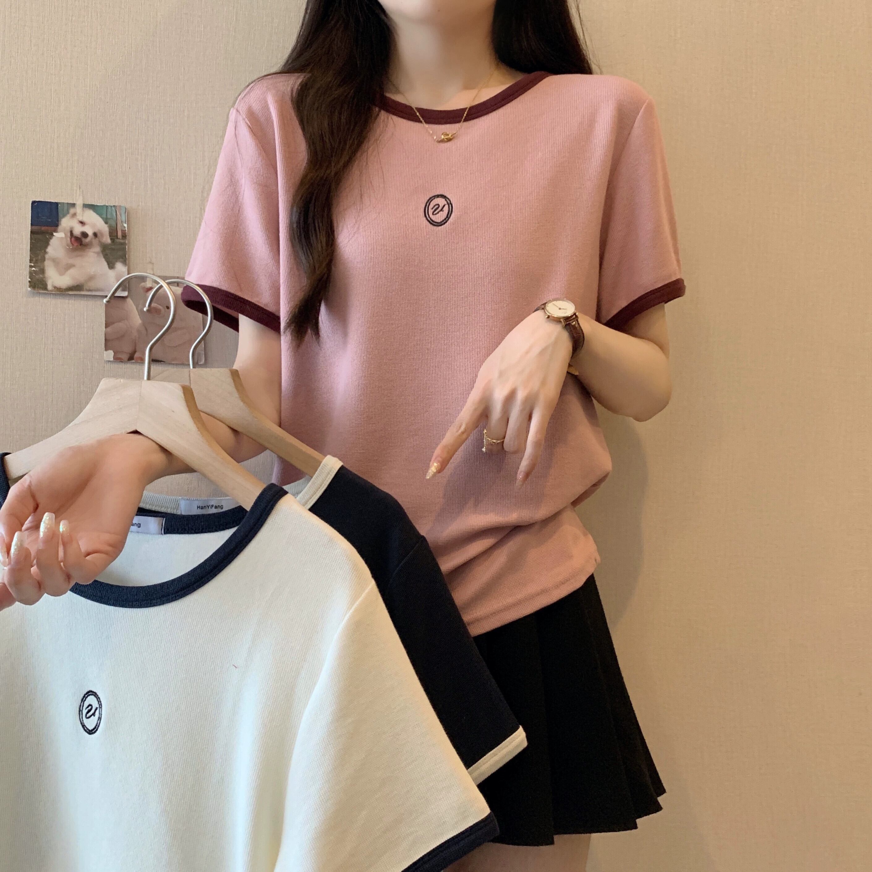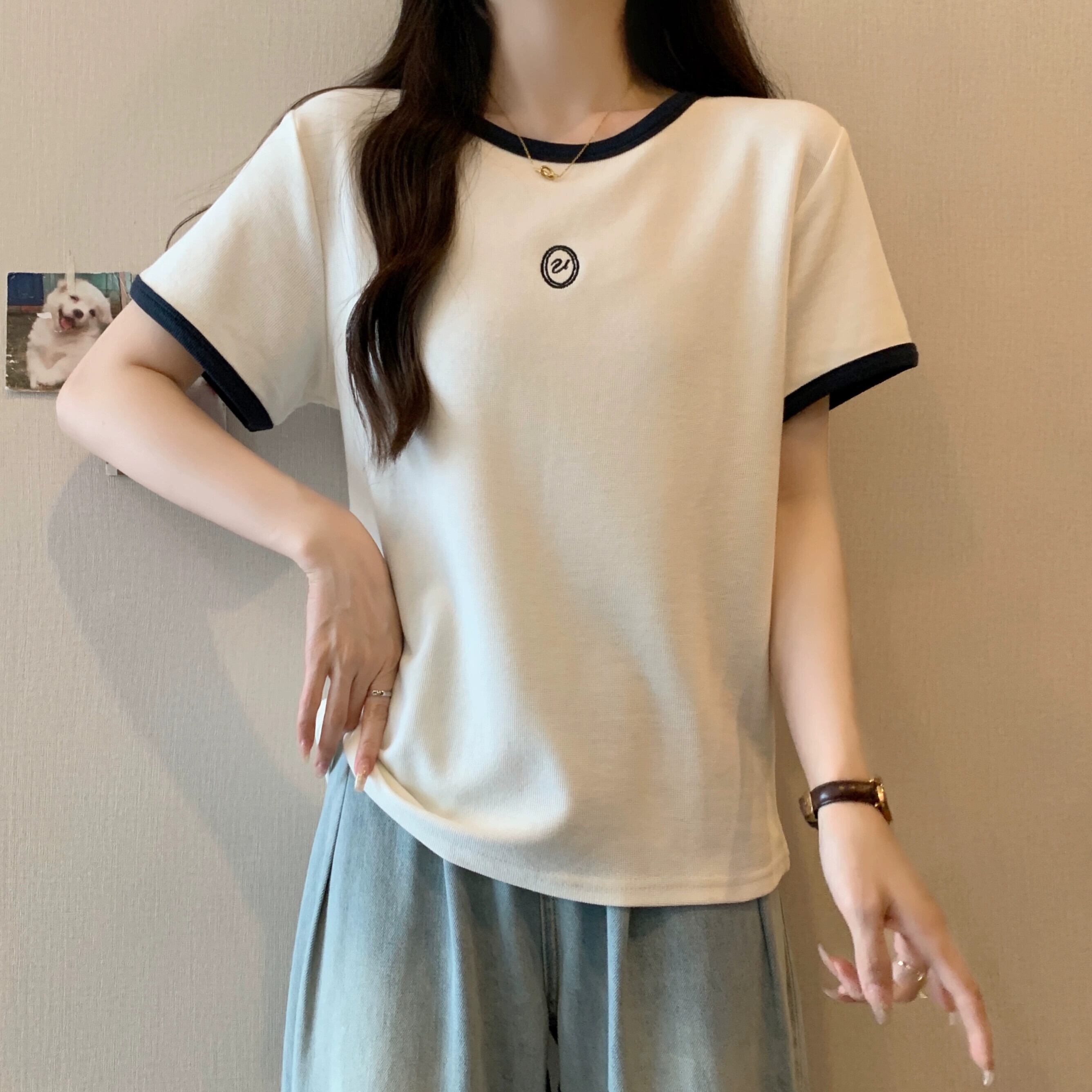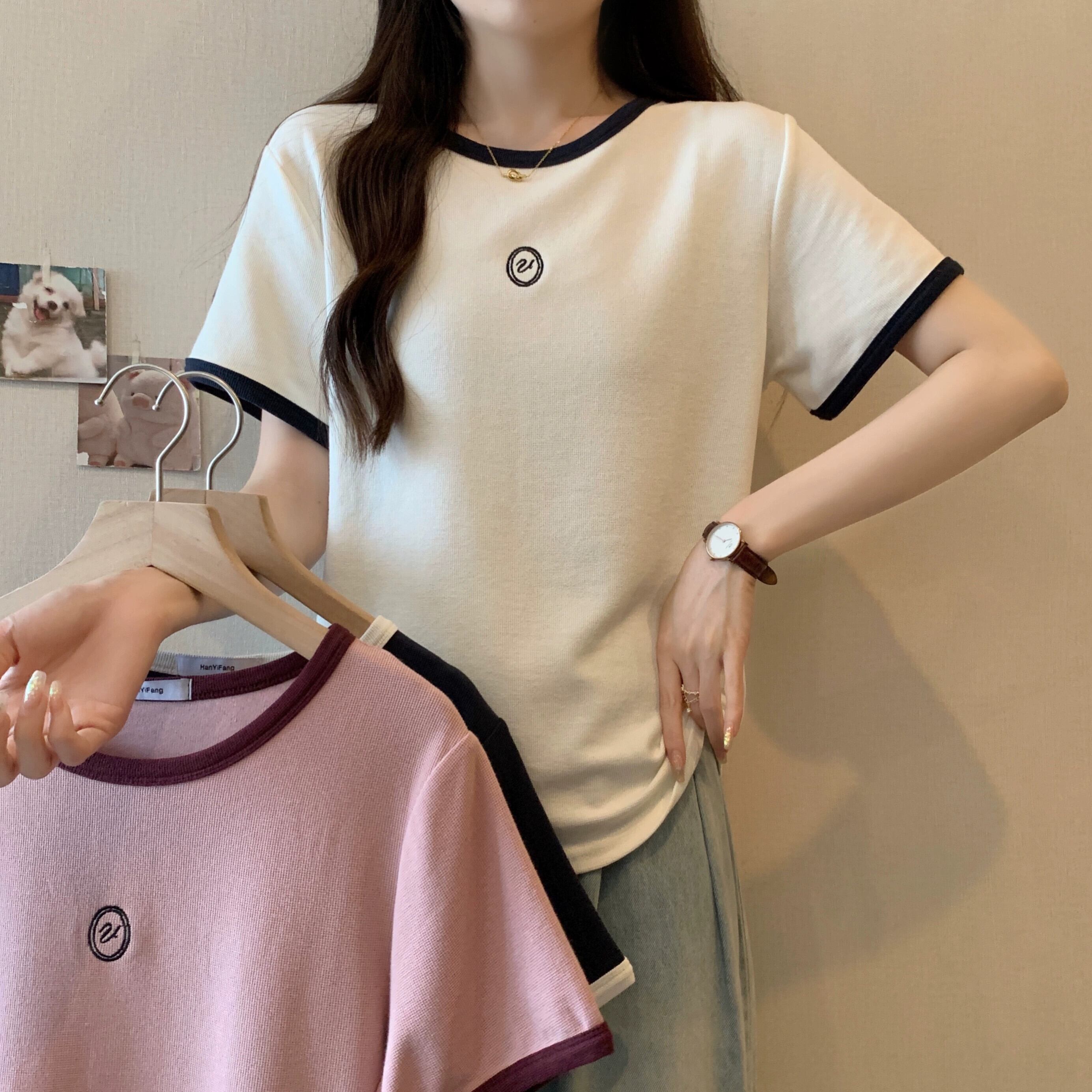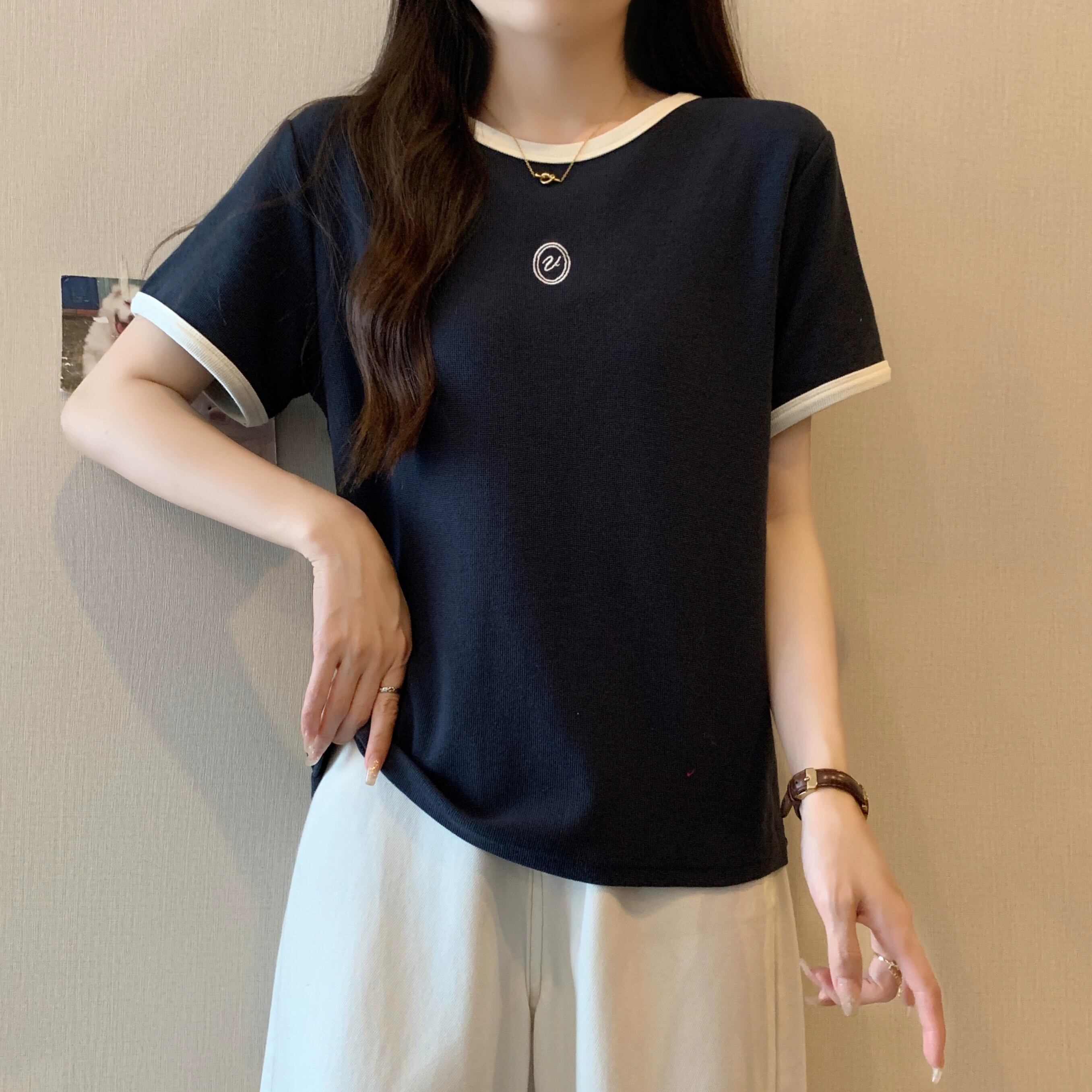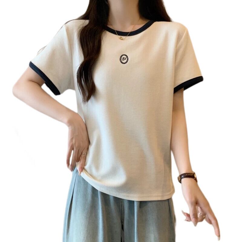 プラスサイズの女性の脂肪 mm 春の新 2024 ラウンドネック痩身刺繍コントラスト右肩半袖 Tシャツ無地トップ 大きめサイズ スプリング 春物 Oネック ソリッドカラー 8884174873344128