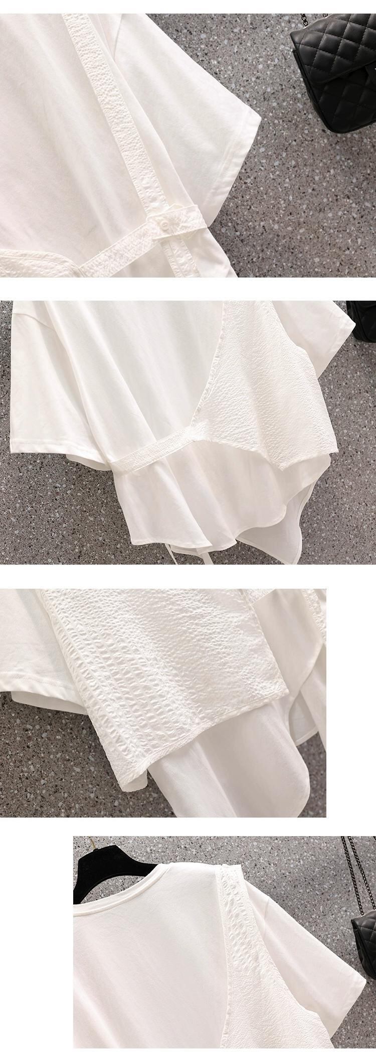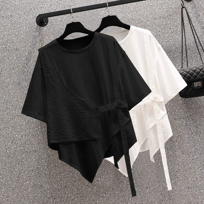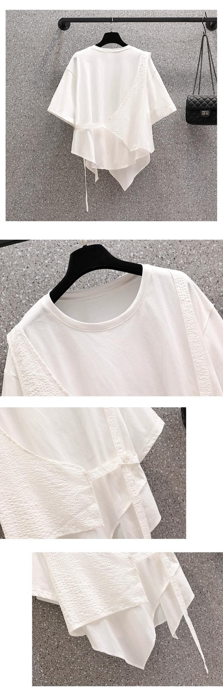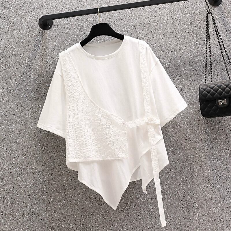プラスサイズの婦人服 2023 夏の新スタイルファットシスタールーズカジュアルスプライシング不規則なフェイクツーピース半袖 T シャツトレンディ 大きめサイズ サマー 夏物 Tシャツ 841S1631246517533
