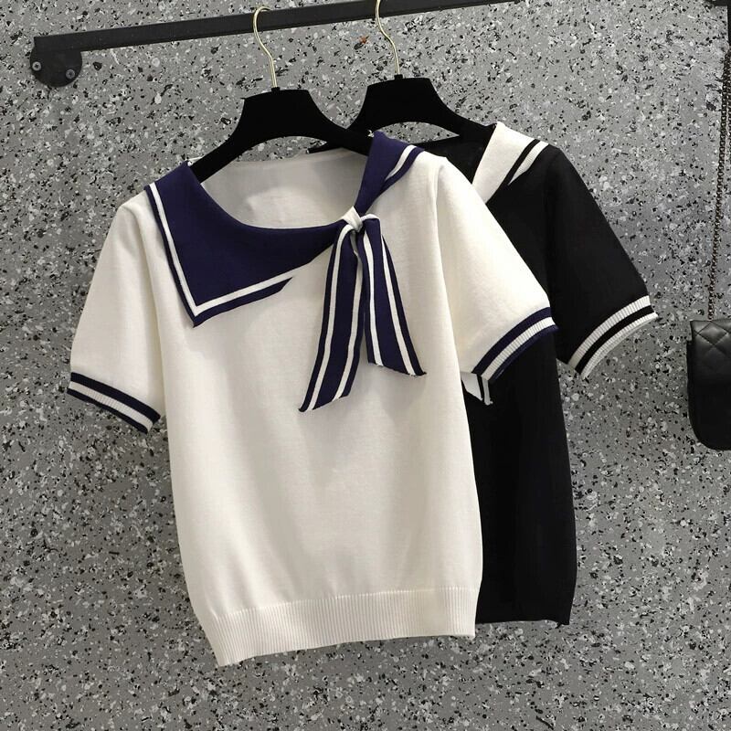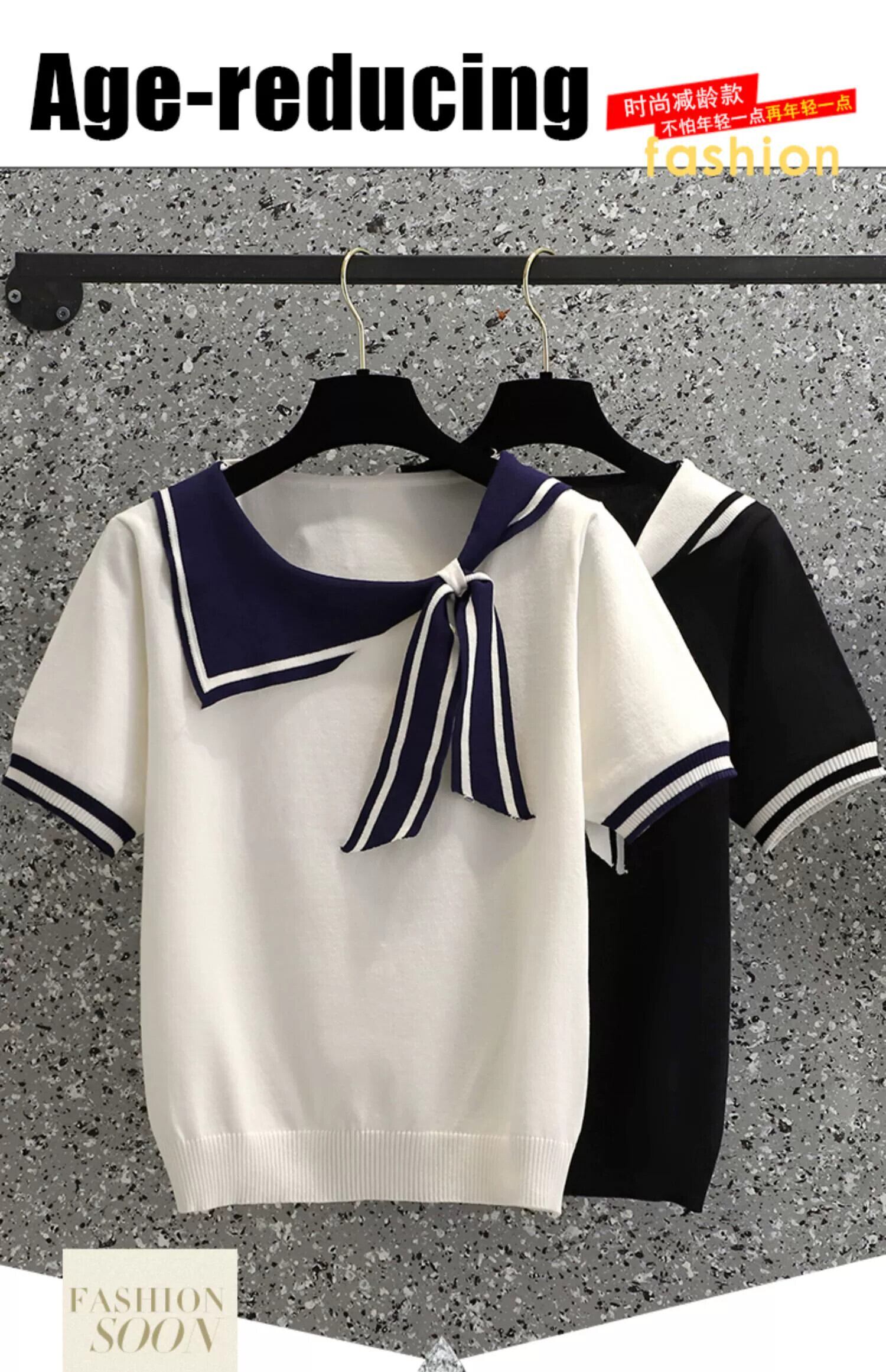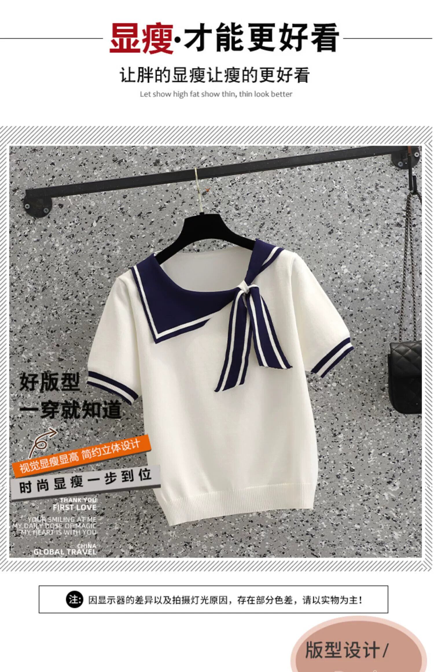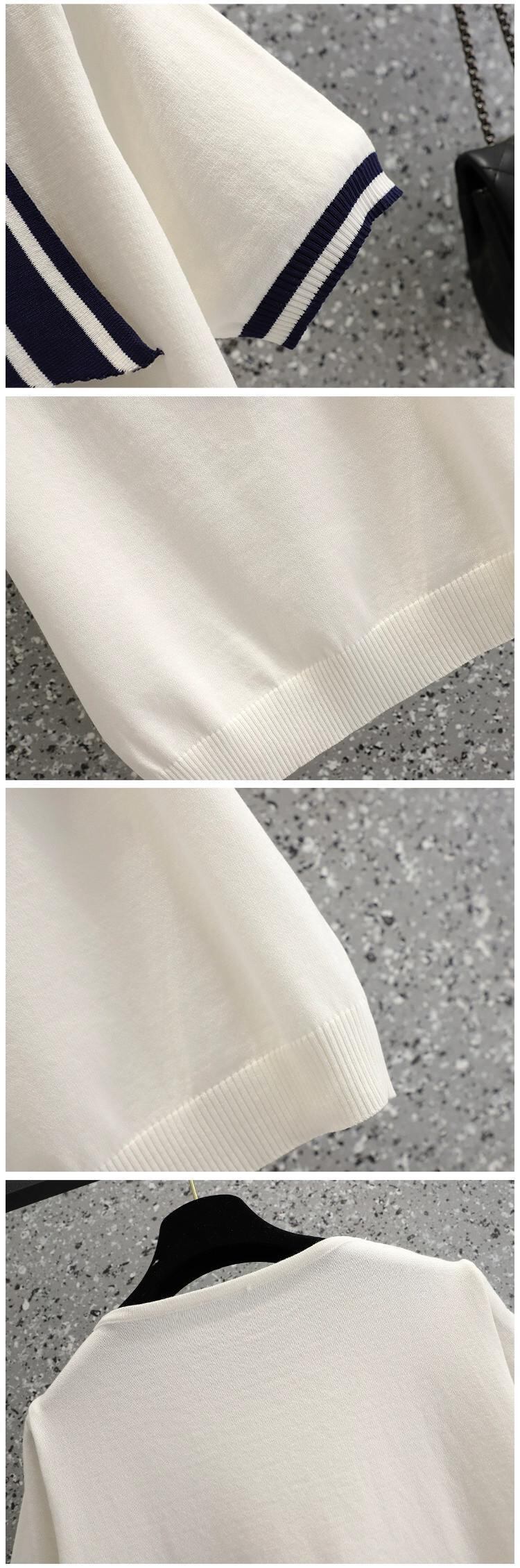 プラスサイズの婦人服 2024 ファットシスターニット Tシャツ気質ネイビーカラー多用途痩身半袖トップ隠し肉サマードレス 大きめサイズ 夏物 841S163812193842