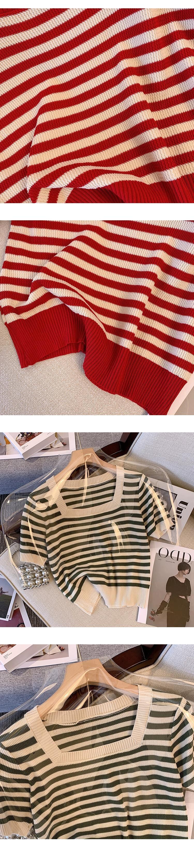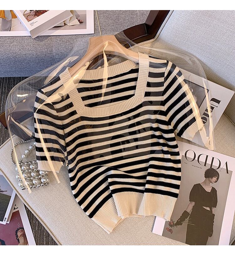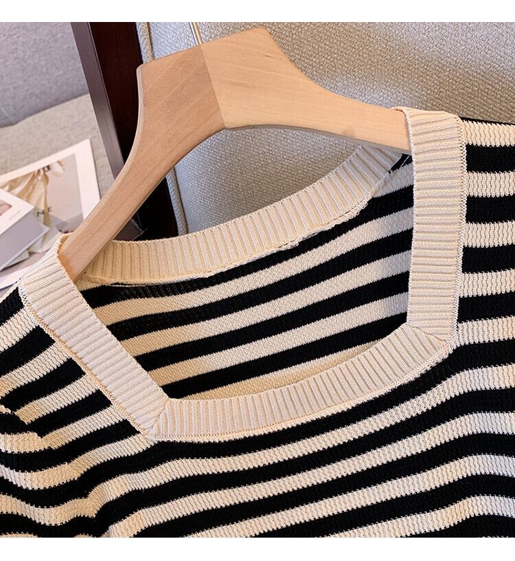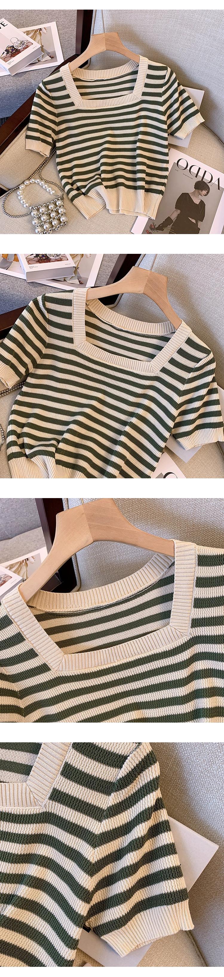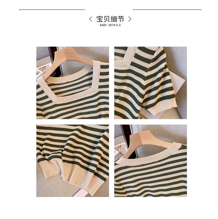 プラスサイズの婦人服 2024 夏の新しいスタイルファットシスターファッショナブルなスクエアカラーショートストライプ多用途半袖肉カバー T シャツトレンディ 大きめサイズ サマー 夏物 Tシャツ スクウェア 841S1668149778682