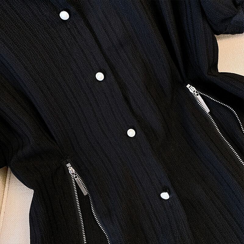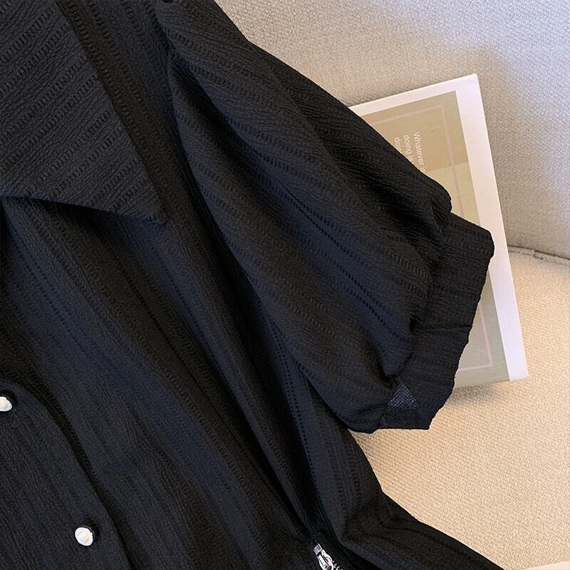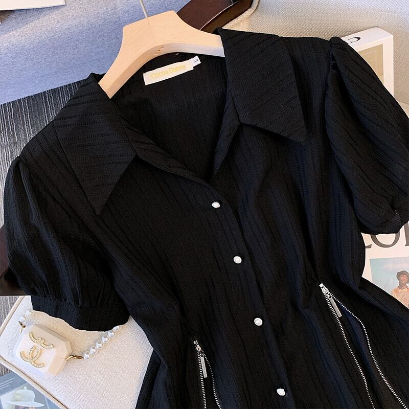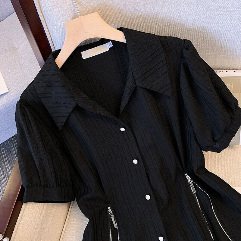 プラスサイズの女性の 2024 夏服脂肪新しい黒ポロ襟ウエスト痩身ジッパーシャツトップストレンディな ブラック 大きめサイズ サマー 夏物 841S1640100251506