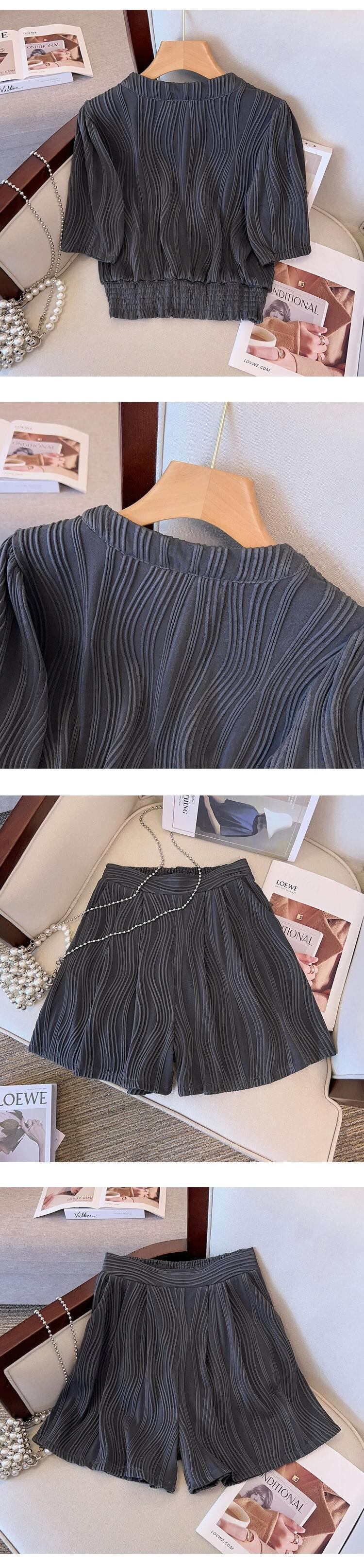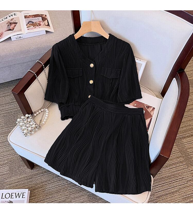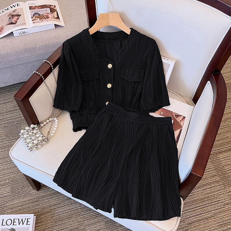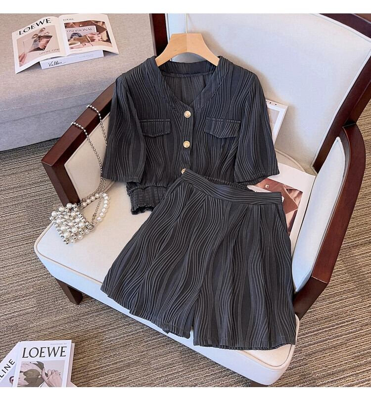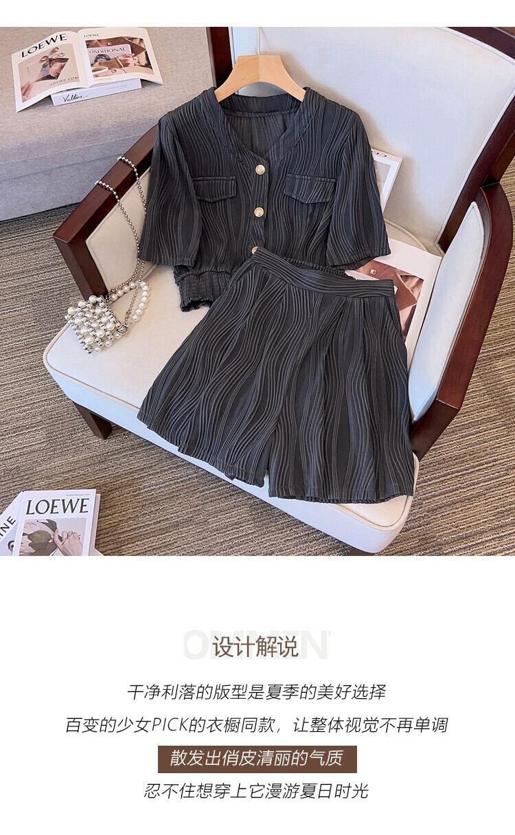 プラスサイズの女性の脂肪夏痩身スーツカジュアルファッションスポーツテクスチャトップワイドレッグショーツ 2 点セット 大きめサイズ サマー 夏物 ブルマー ワイドパンツ 841S1634349270179