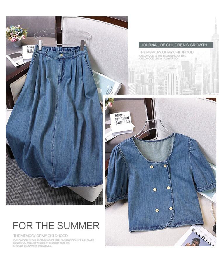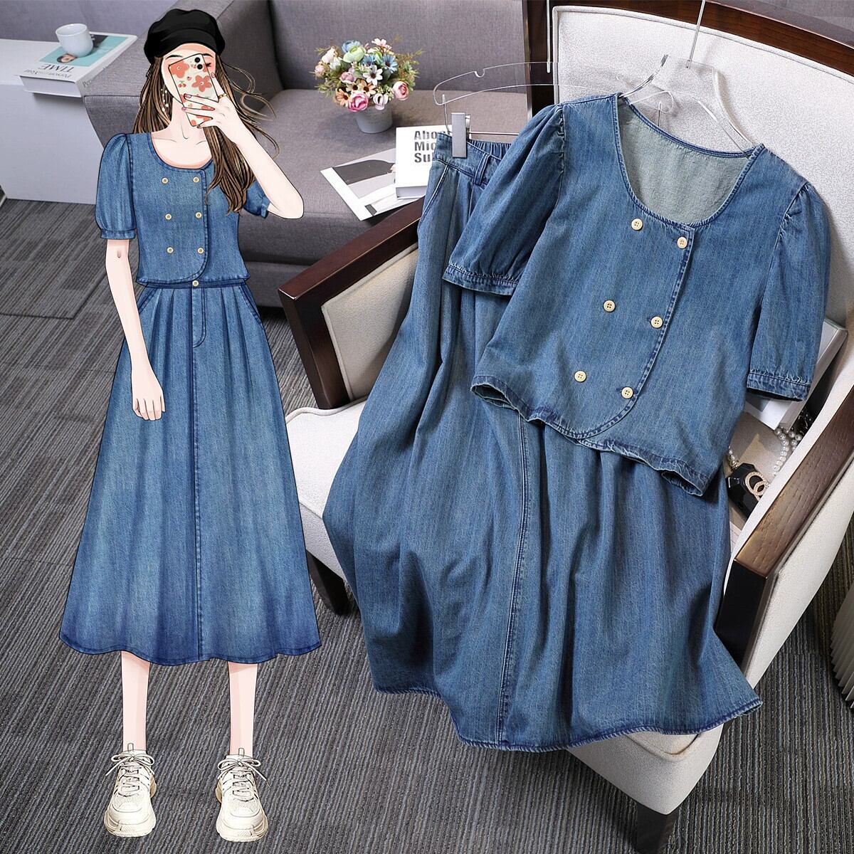 プラスサイズの婦人服 2024 脂肪姉妹夏の新しいデニムスーツスリム A ラインスカート気質多目的シャツ 2 点セット 大きめサイズ サマー 夏物 Aライン 841S1691079644522