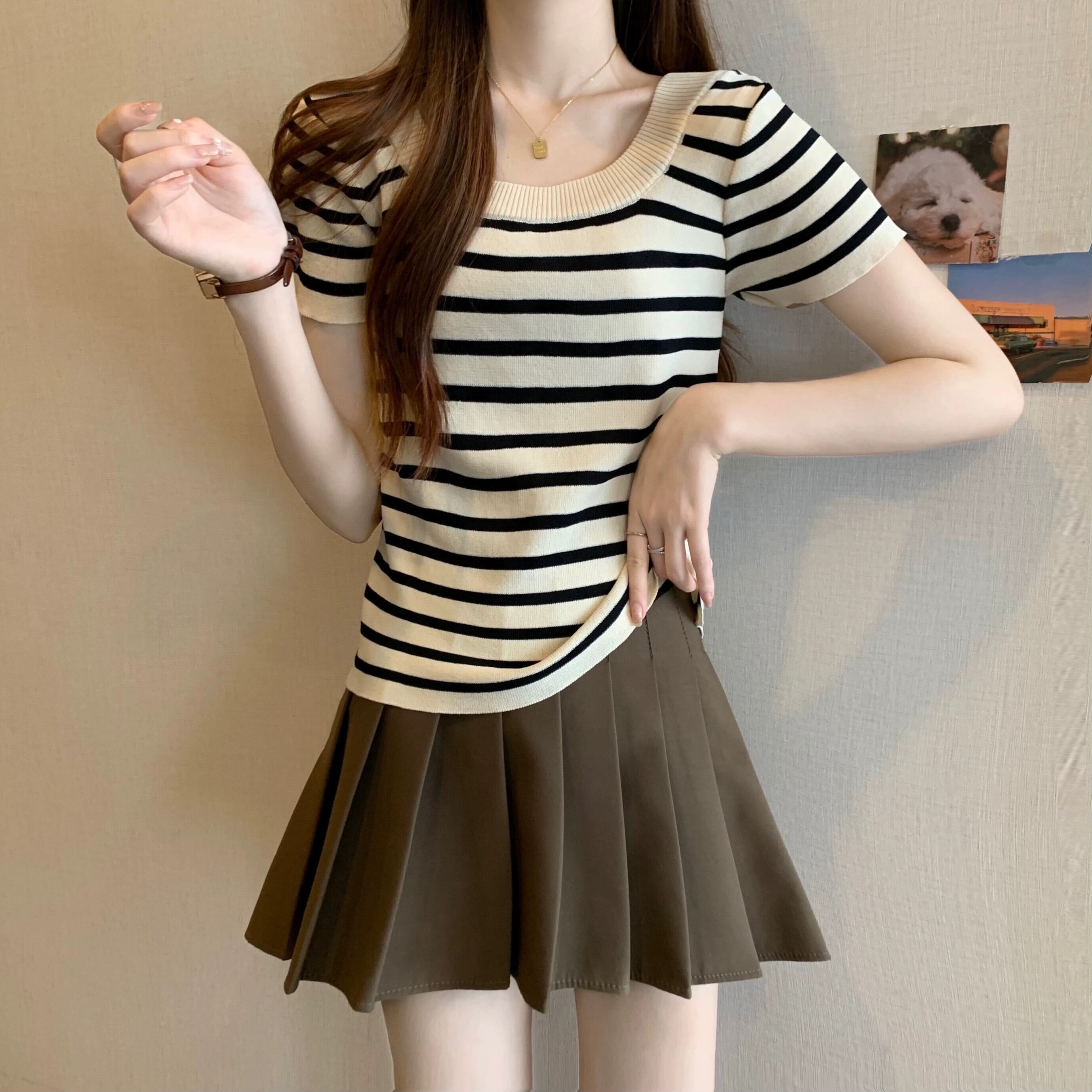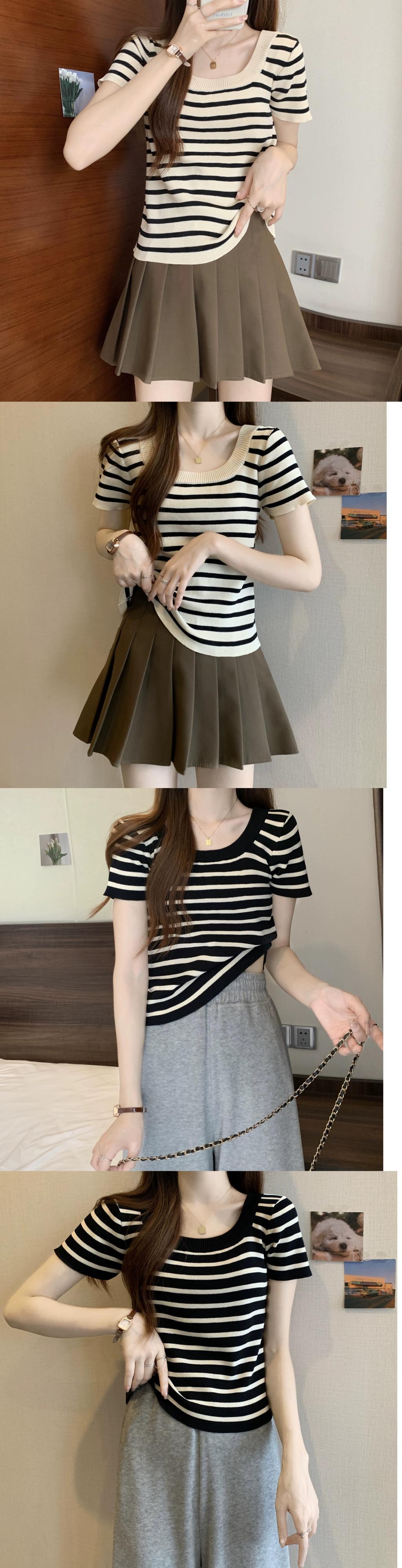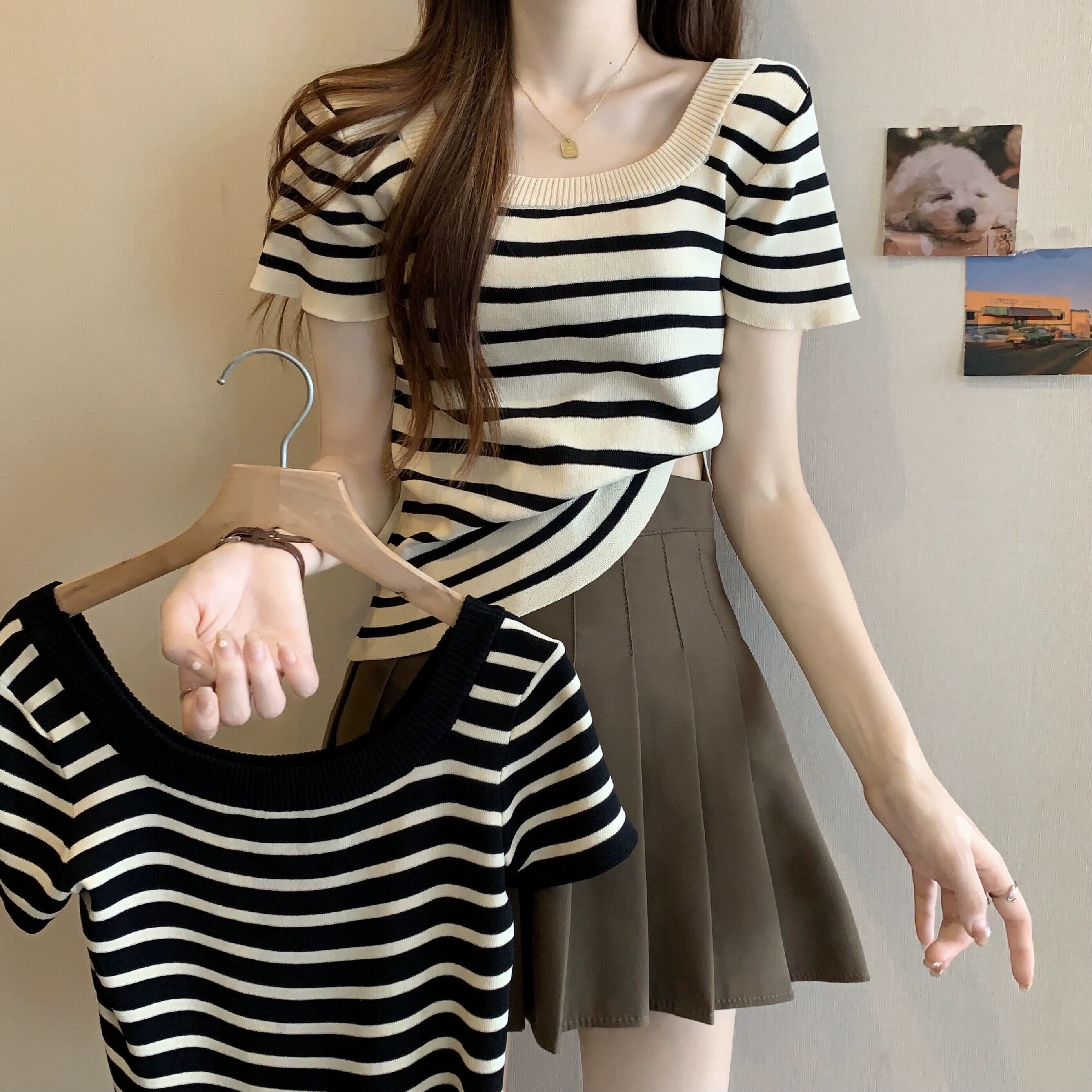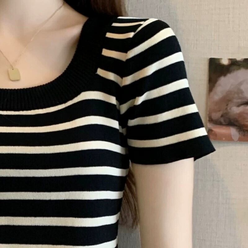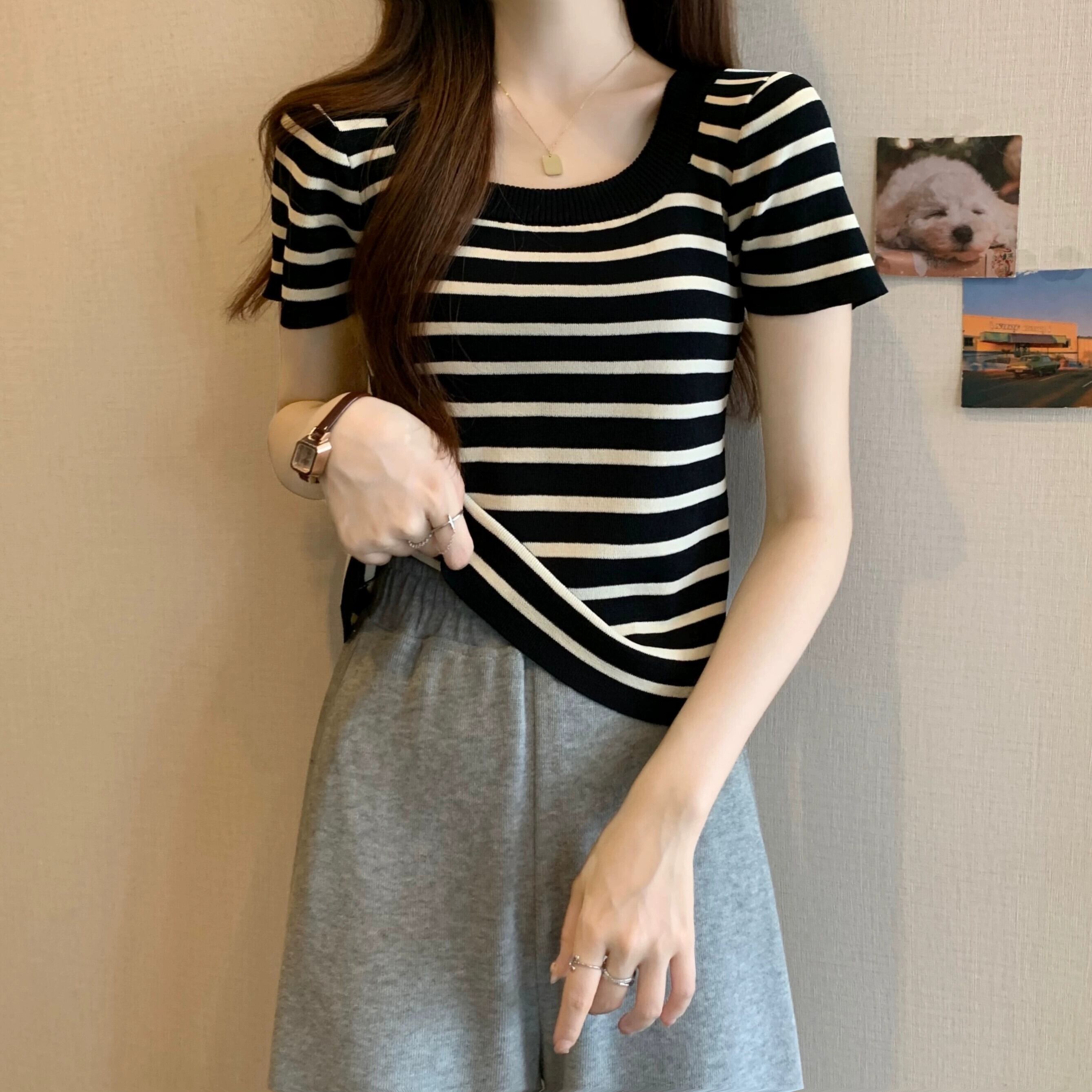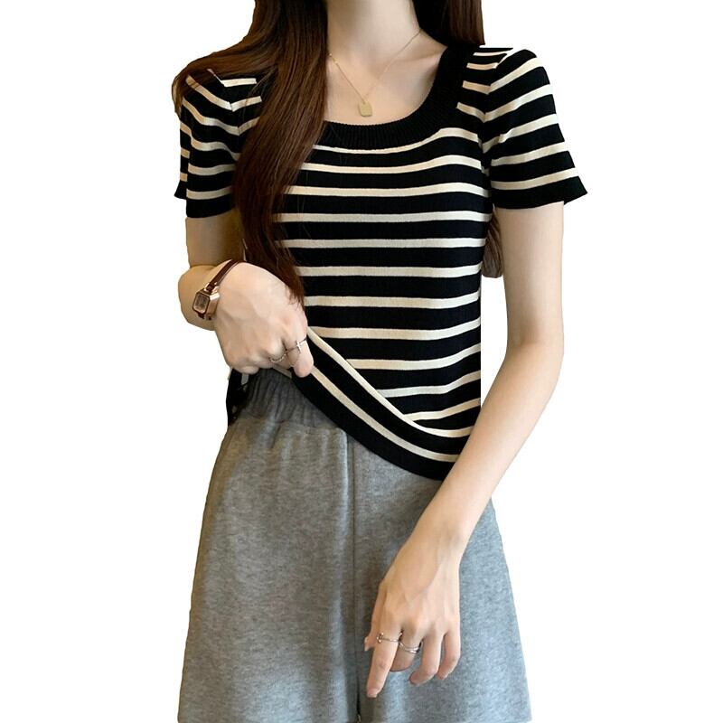 プラスサイズの女性の 2024 夏服ファットシスターストライプスタイル年齢軽減右肩ニット Tシャツフレンチベリーカバートップ 大きめサイズ サマー 夏物 841S1644219984059
