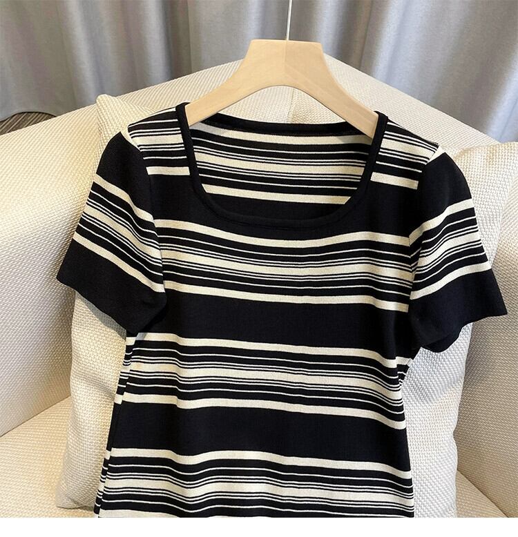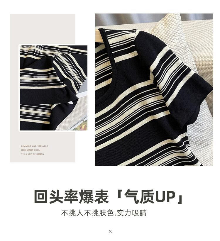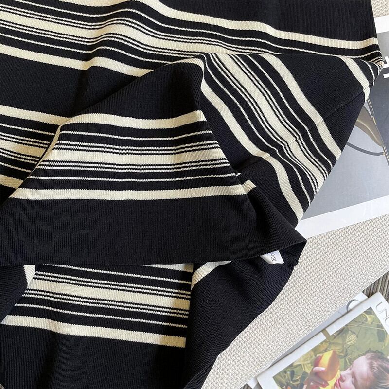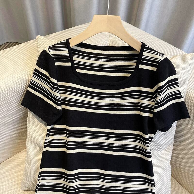 プラスサイズの女性の 2024 夏服ファットシスターシンプルなスクエアネックルーズミッドレングスストライプニットドレス 大きめサイズ サマー 夏物 スクウェア 841S1679588006043