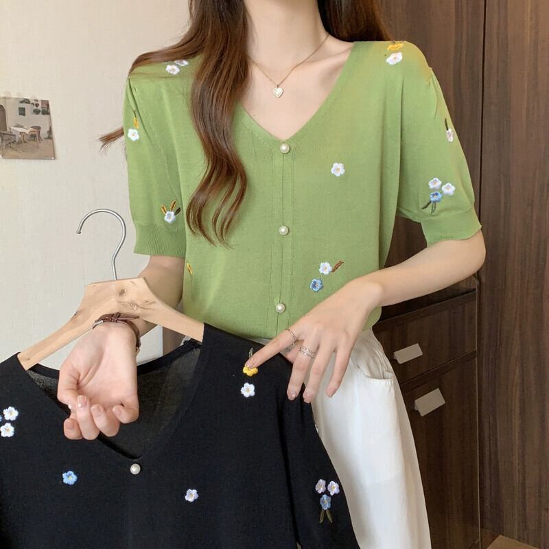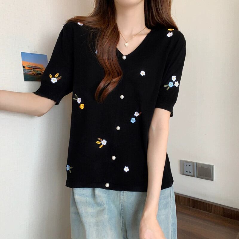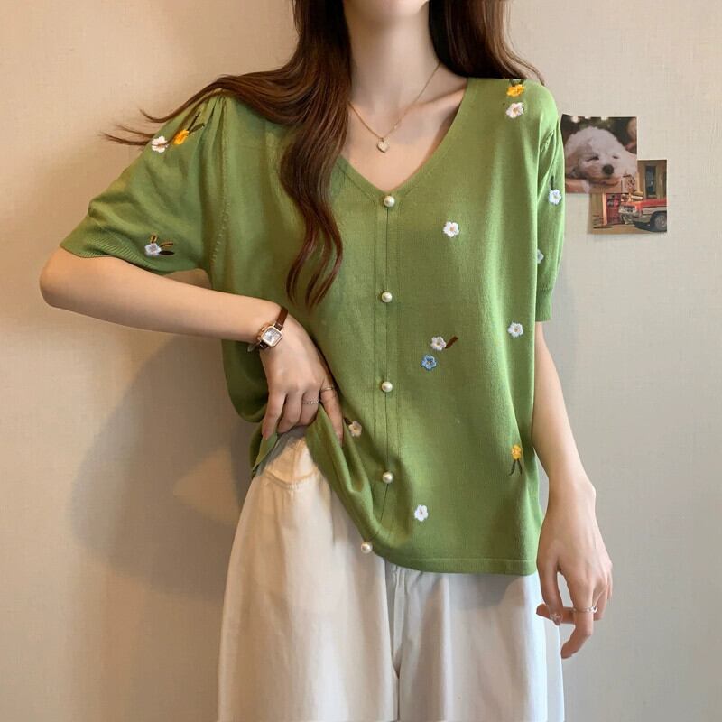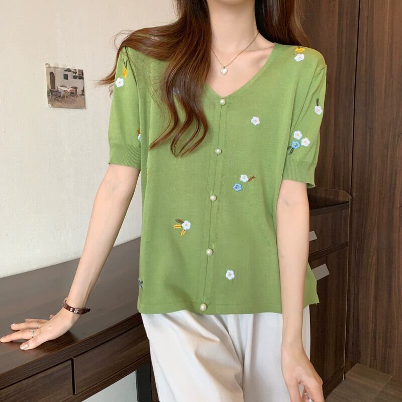 プラスサイズの女性の 2024 脂肪姉妹夏服新ファッション年齢軽減刺繍 V ネック Tシャツアイスシルク半袖トップ レッド 大きめサイズ サマー 夏物 Vネック 841S165000089094