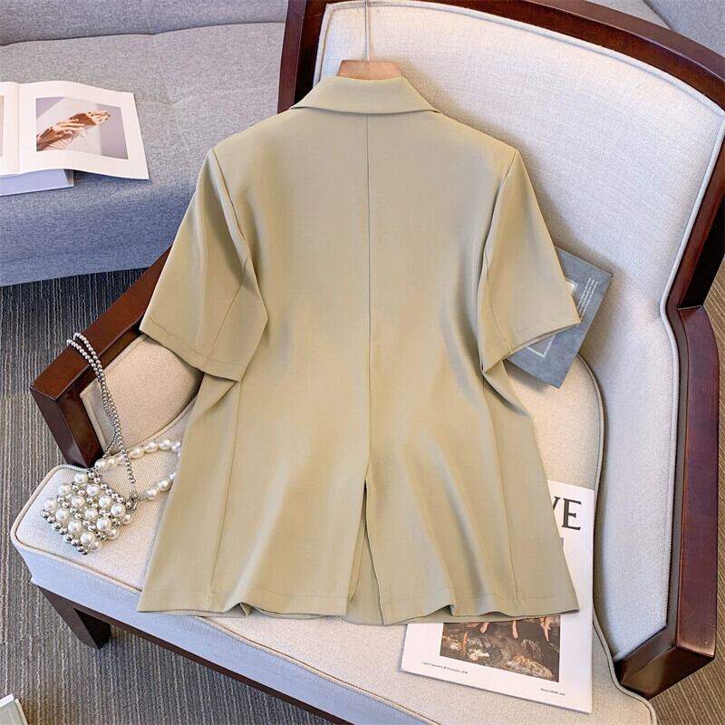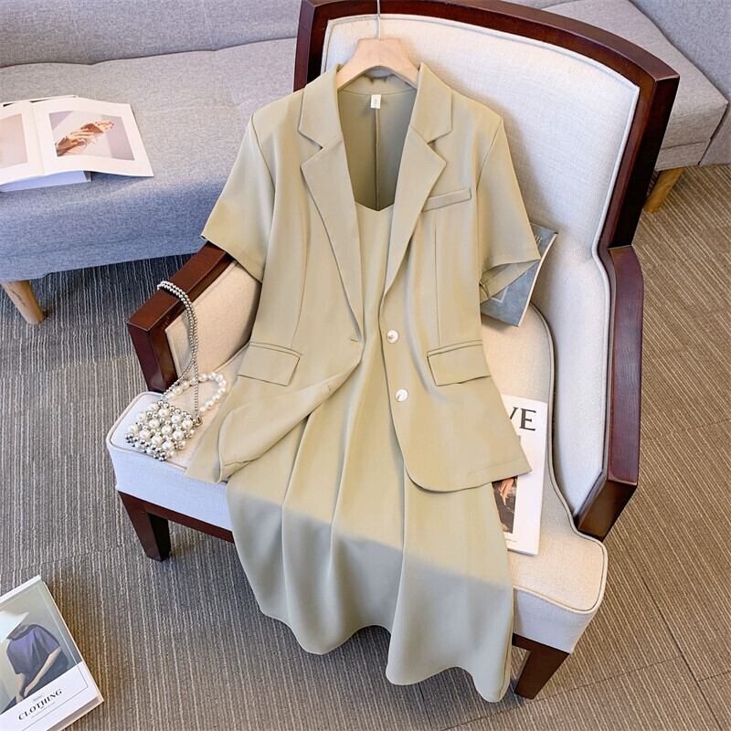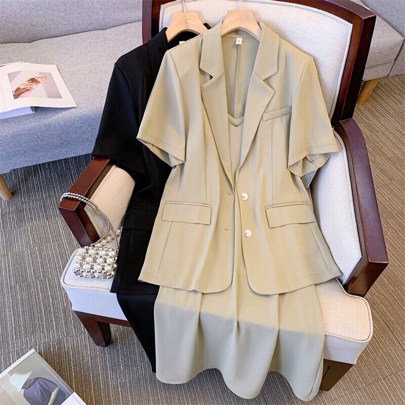 プラスサイズの女性の 2024 夏の新しいスタイルファットシスターファッショナブルな半袖ジャケット痩身サスペンダードレス 2 点セット 大きめサイズ サマー 夏物 841S1661174582285