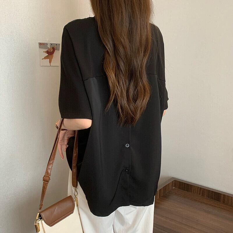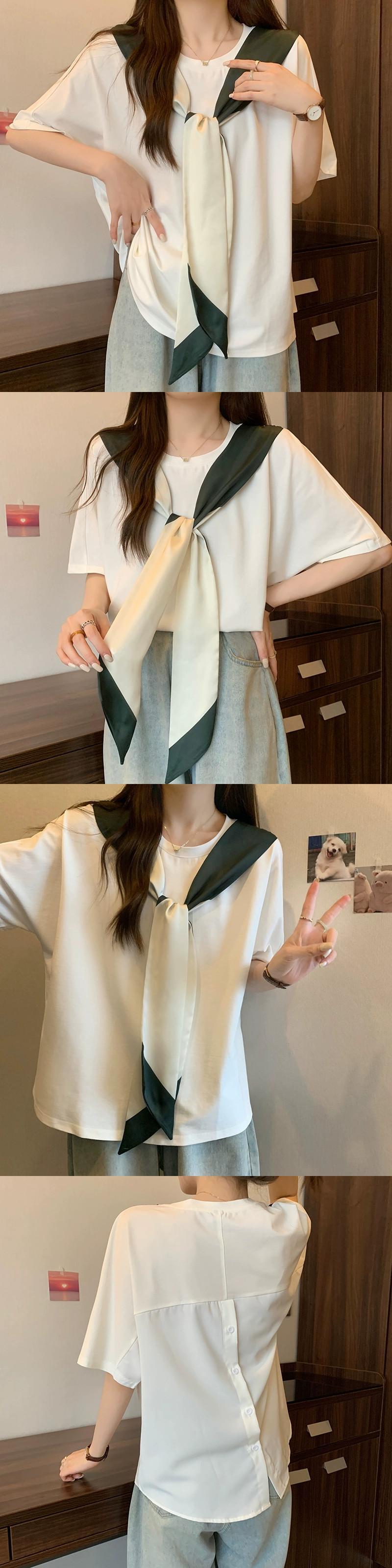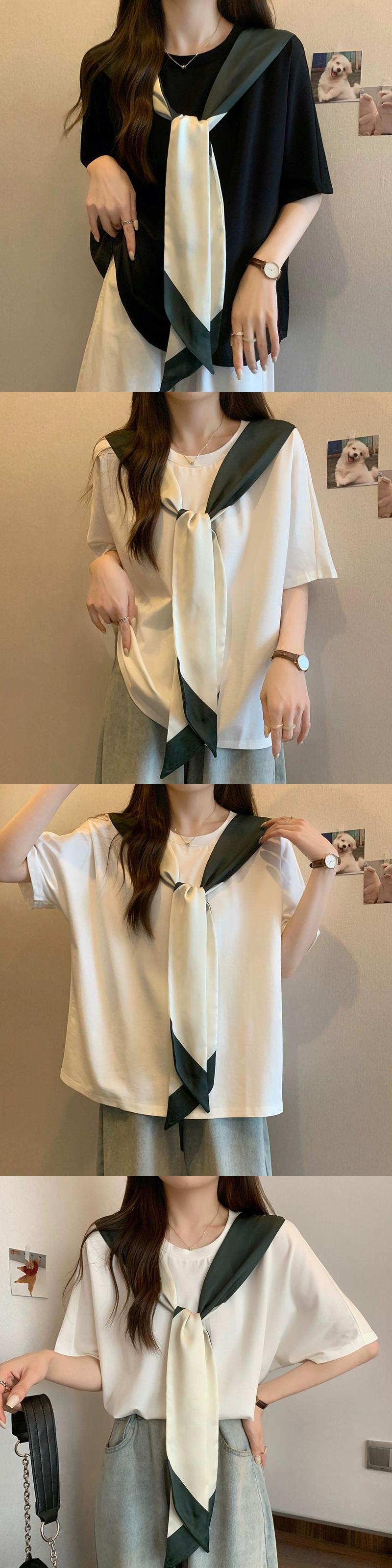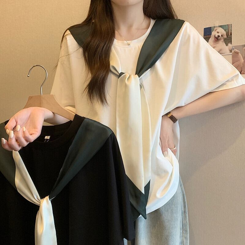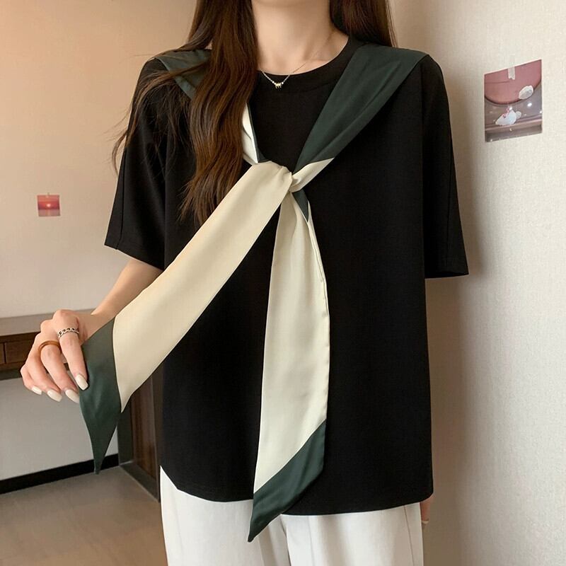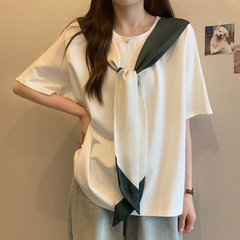 プラスサイズの婦人服 2024 脂肪姉妹夏服新しいルーズデザインシルクスカーフリボンラウンドネック半袖 Tシャツトップ 大きめサイズ サマー 夏物 Oネック 841S1615229217470