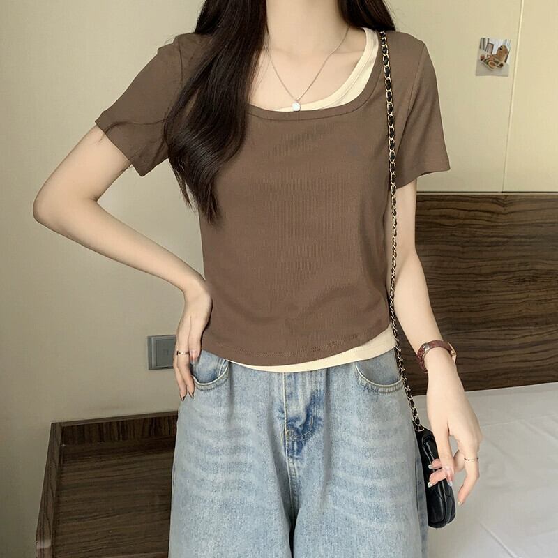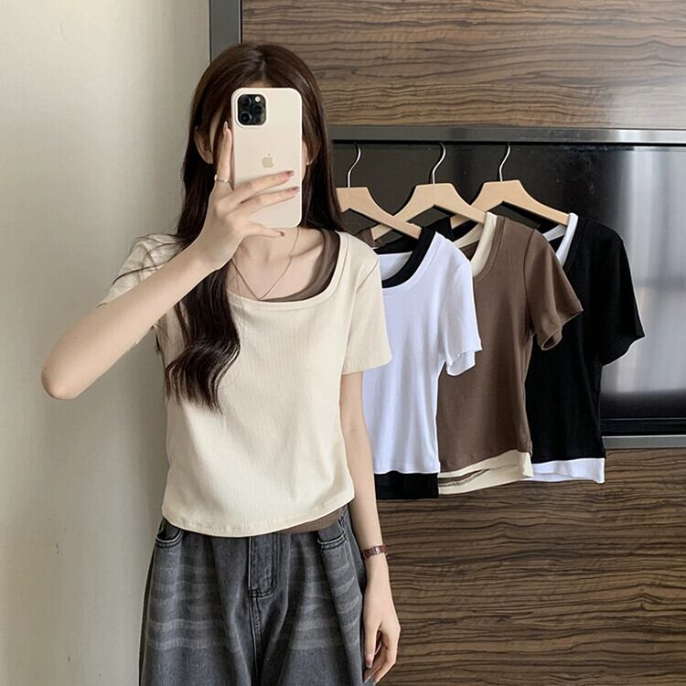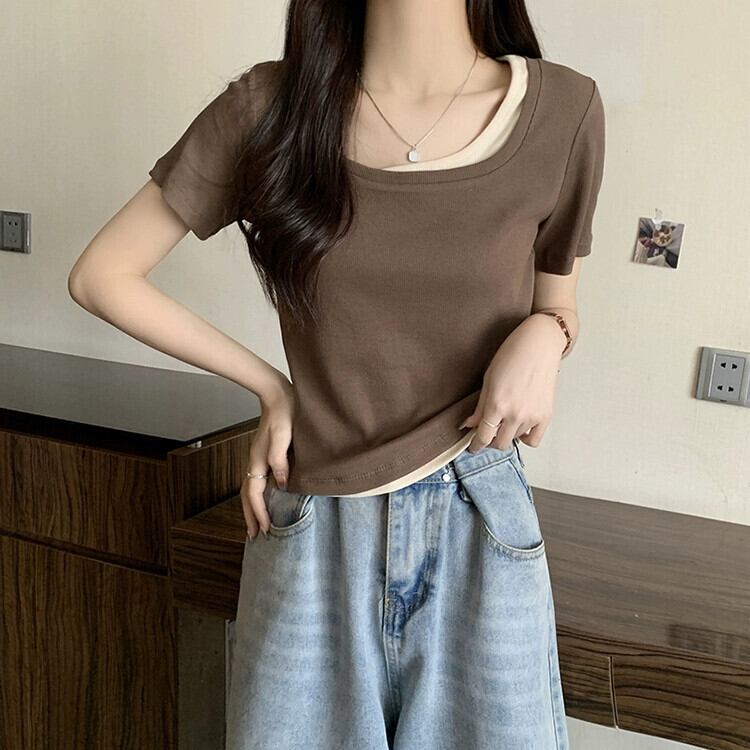 夏服太り、万能、着痩せ、シンプルな偽ツーピースTシャツ、シックなフレンチボトムシャツ、お腹をカバーするトップス、ニッチ サマー 夏物 841S1680262481729