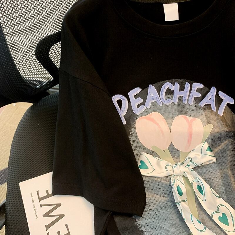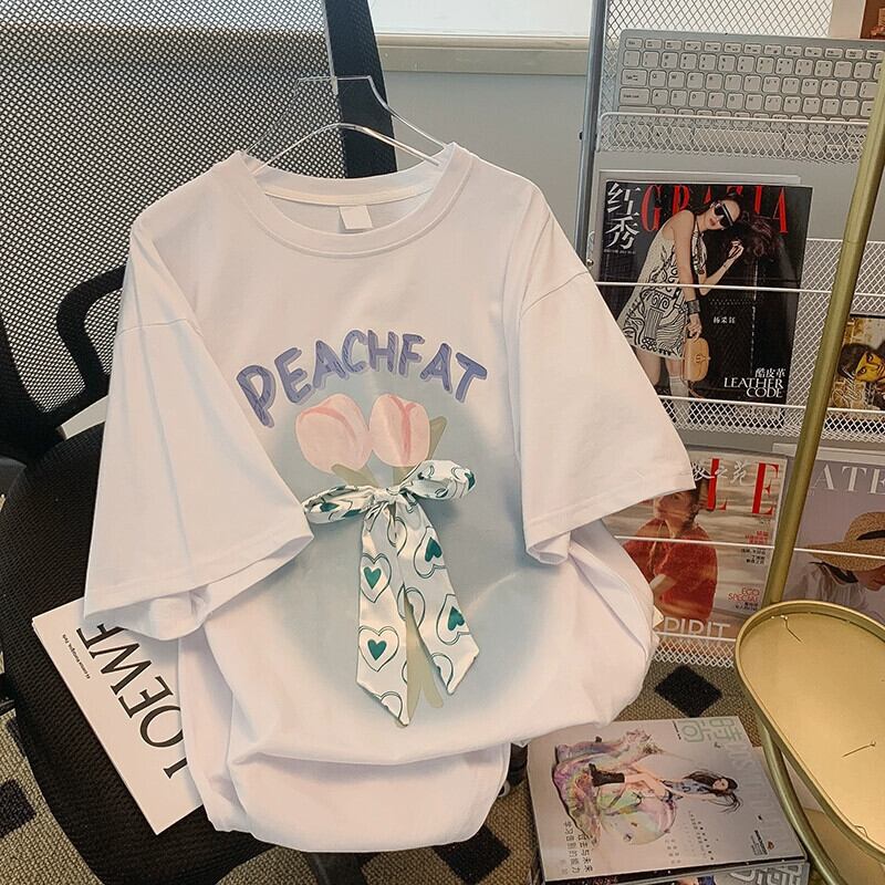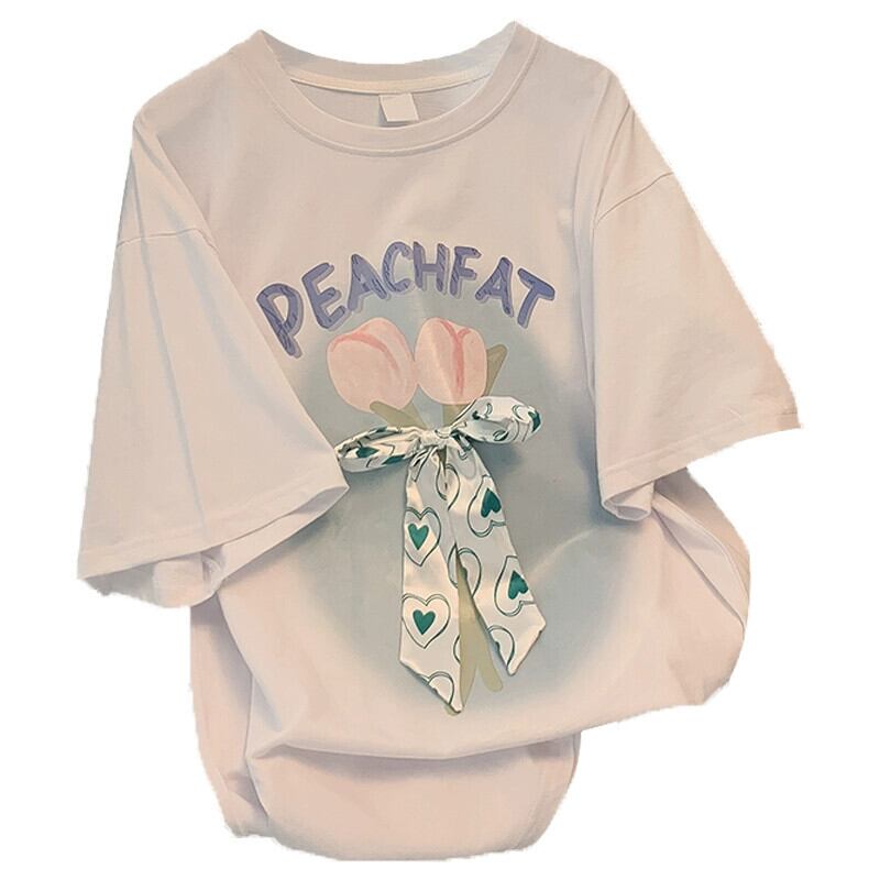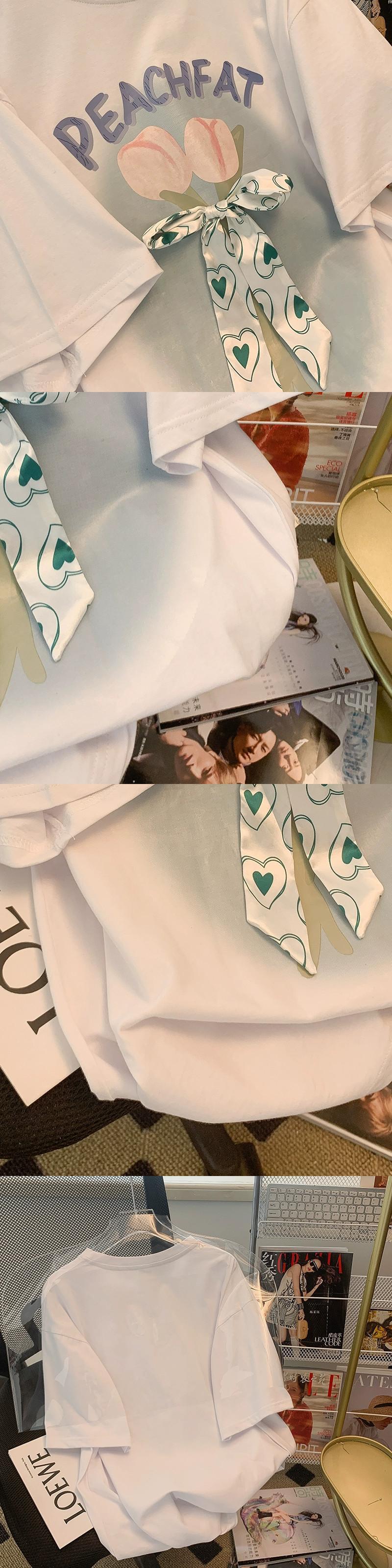 プラスサイズの女性の 2024 ファットシスター夏服デザインプリントリボン立体装飾半袖 T シャツトップ 大きめサイズ サマー 夏物 Tシャツ 841S1692532450472