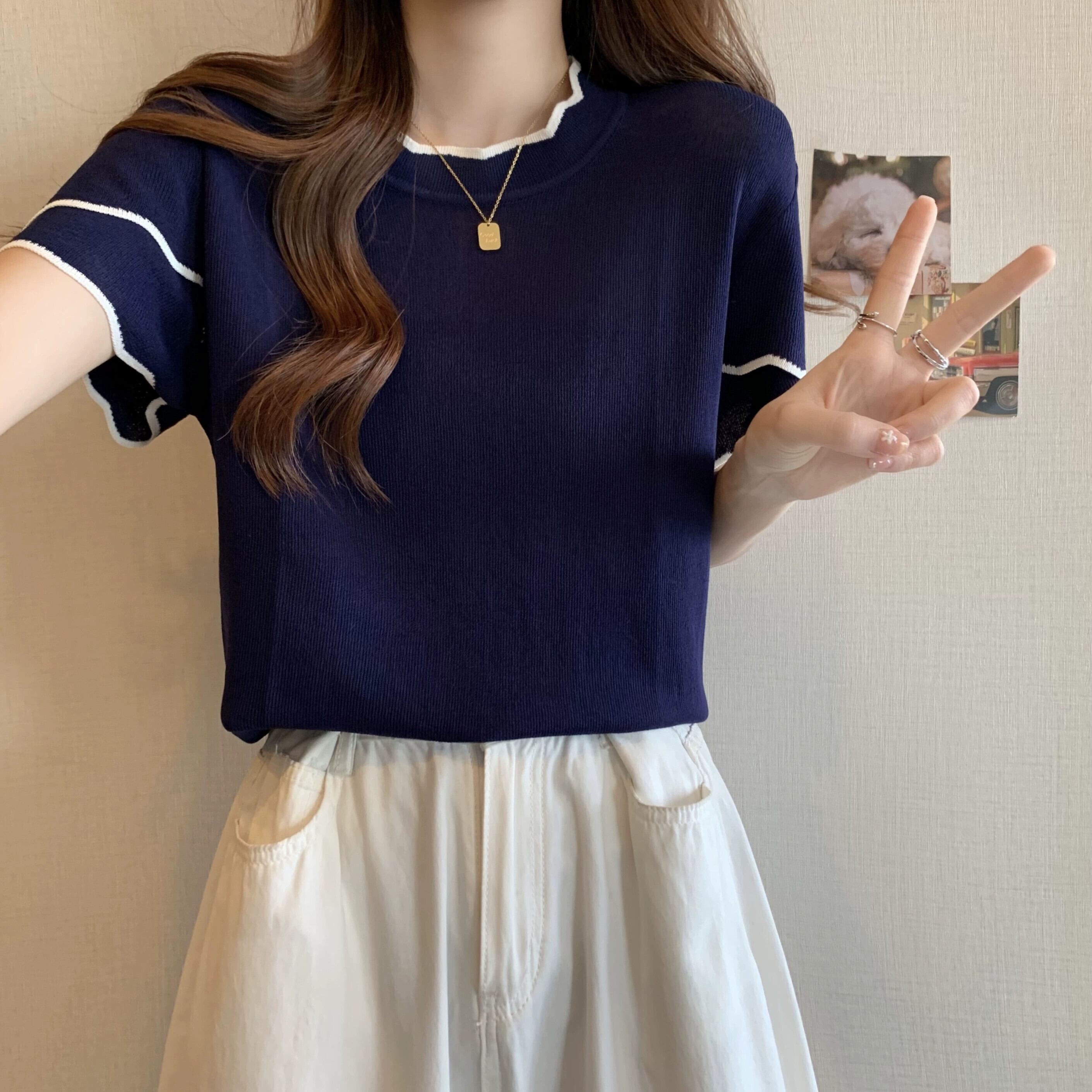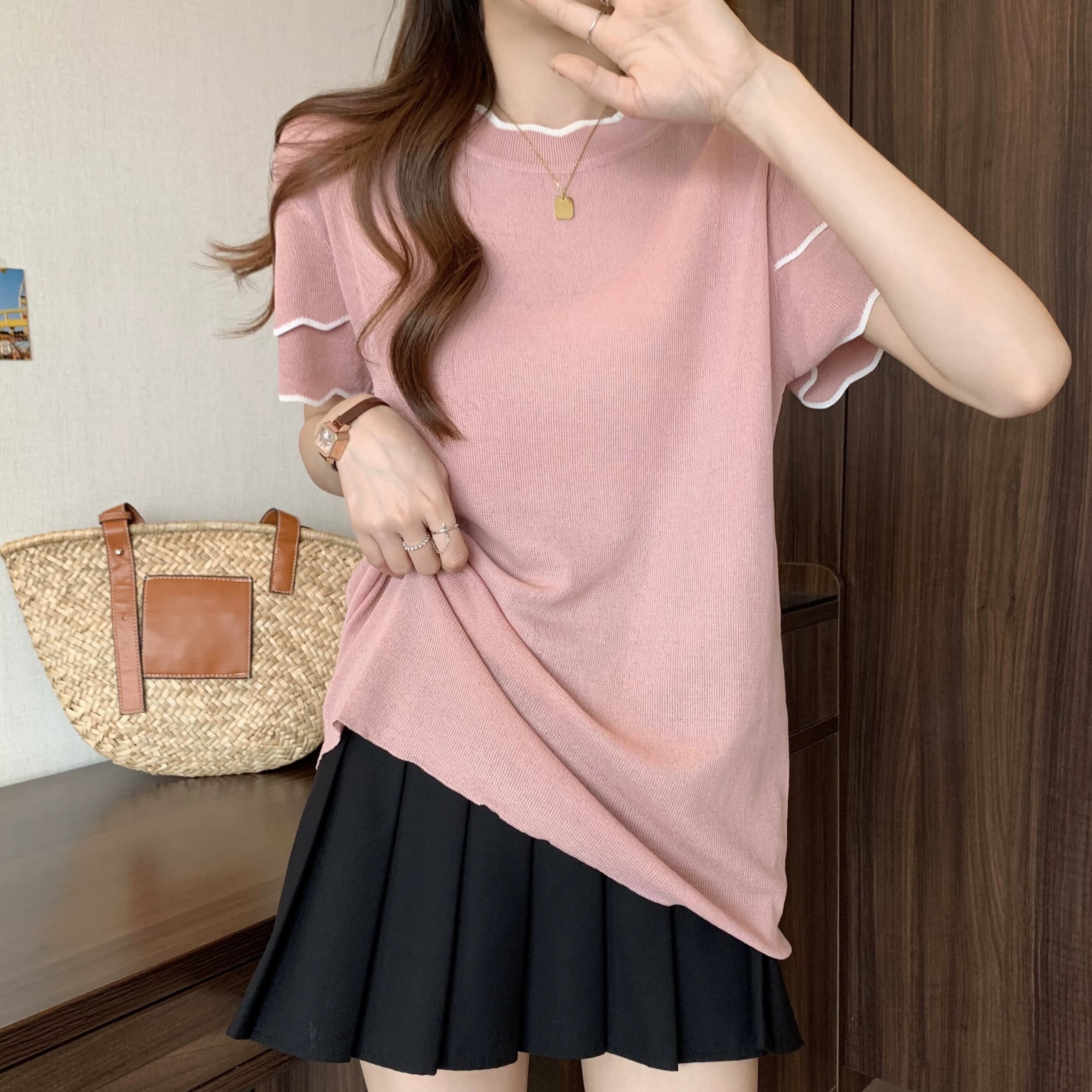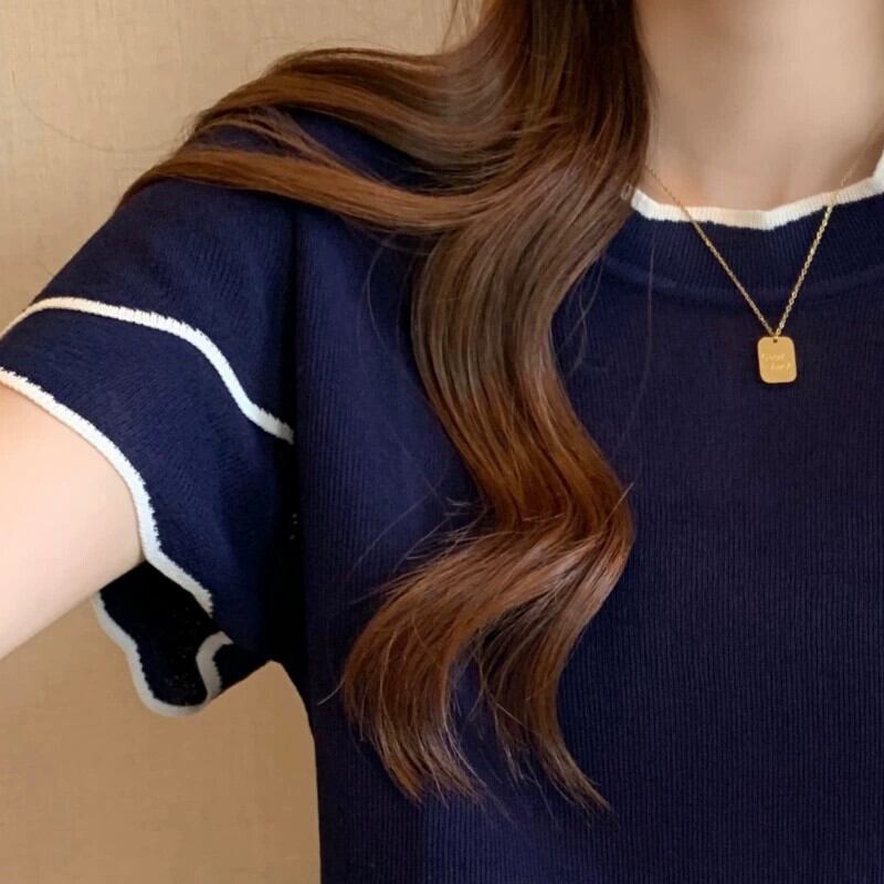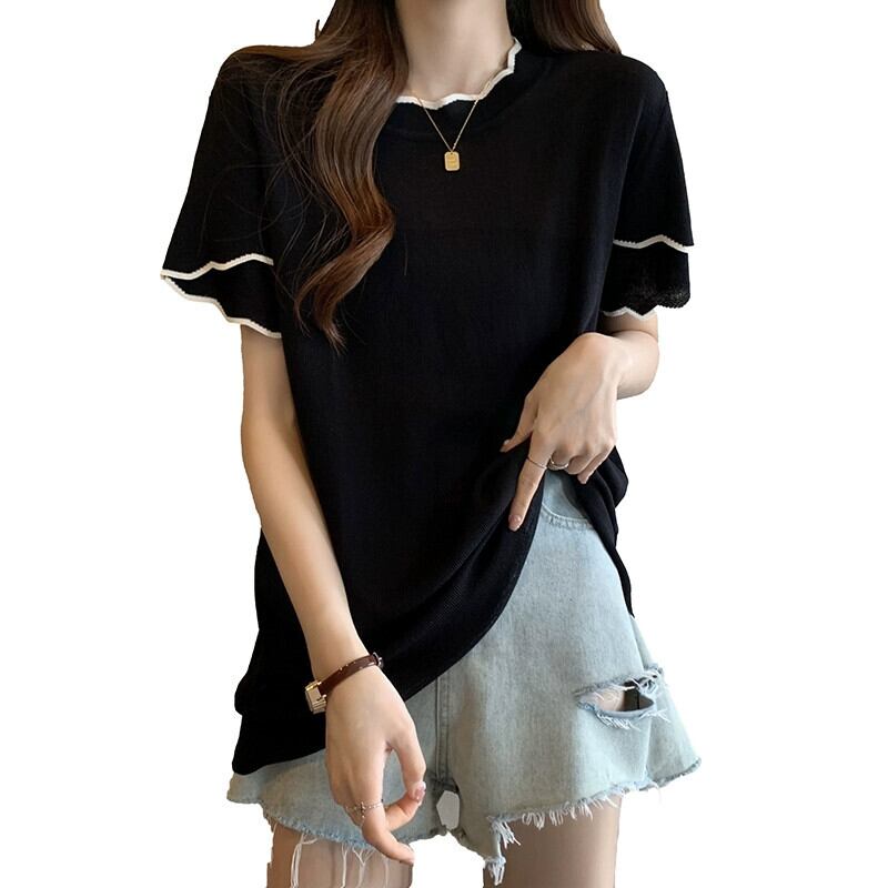 プラスサイズの女性の 2024 夏の新しいスタイル脂肪痩身気質デザインラウンドネック多用途半袖トップス 大きめサイズ サマー 夏物 Oネック 841S1675602958160