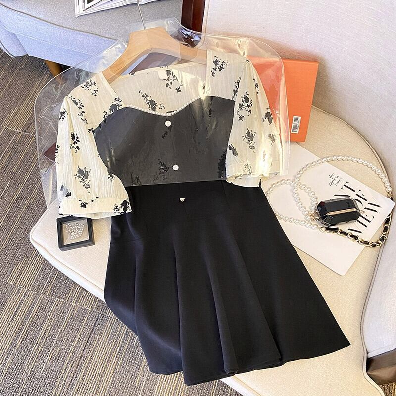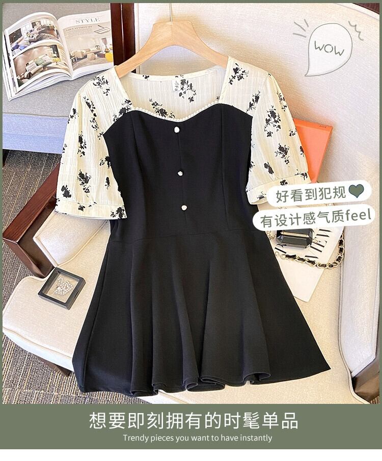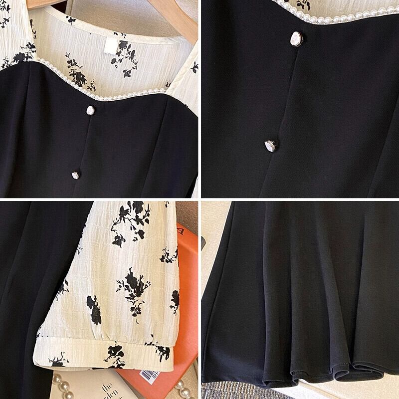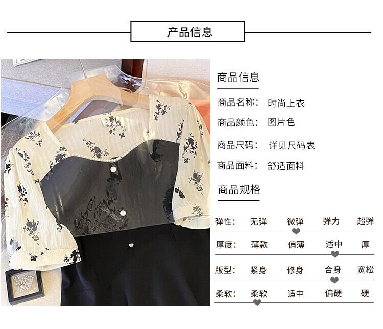 プラスサイズの女性の 2024 ファットシスターサマーシャツコントラストカラースプライシングシフォンスクエアネックシャツお腹をカバーしスリミング半袖トップ 大きめサイズ 夏物 スクウェア 841S1635460470270