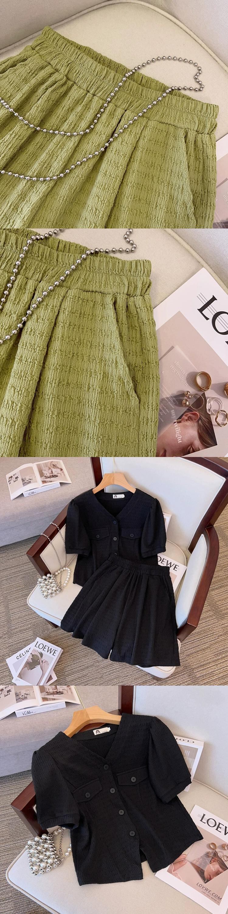 プラスサイズの婦人服 2024 夏服脂肪の新しいファッションスーツスリム V ネックトップルーズショーツ 2 点セット 大きめサイズ サマー 夏物 ブルマー Vネック 841S1654793728902