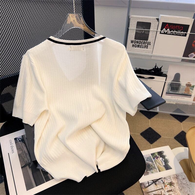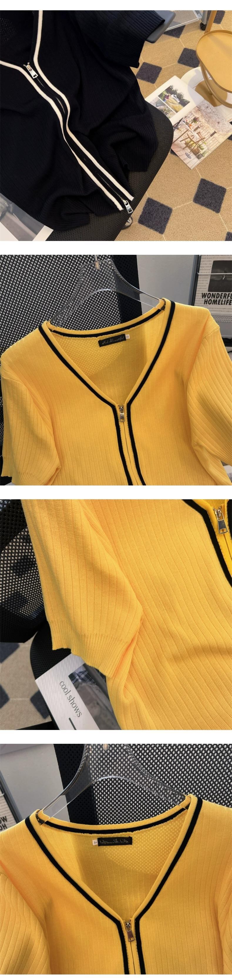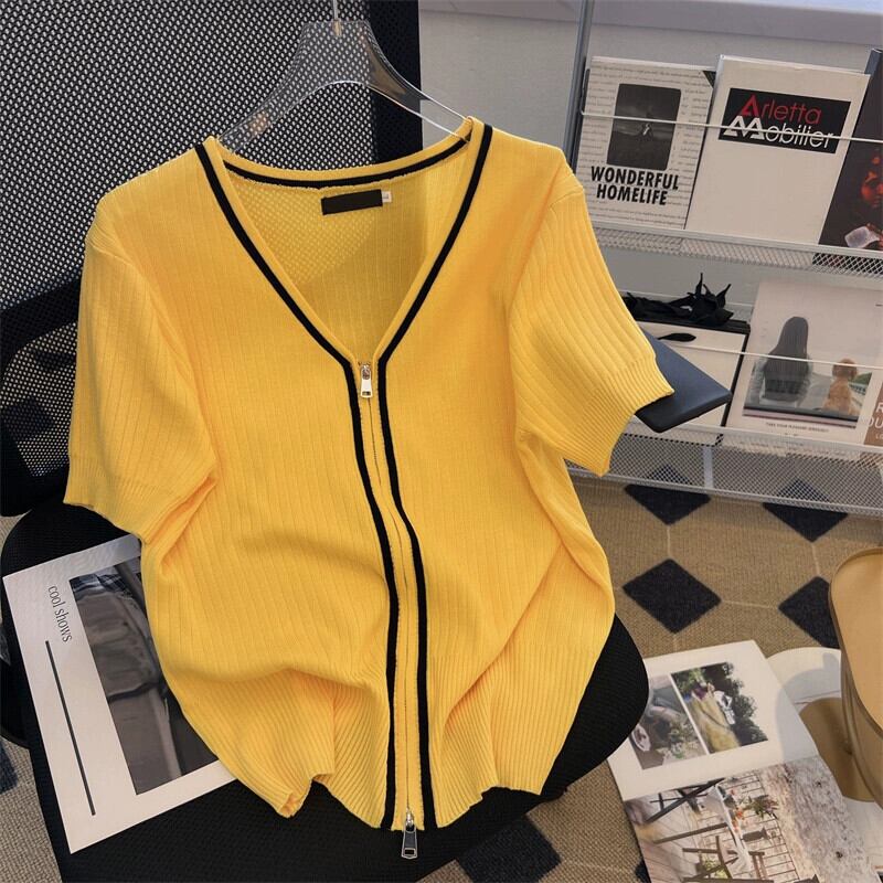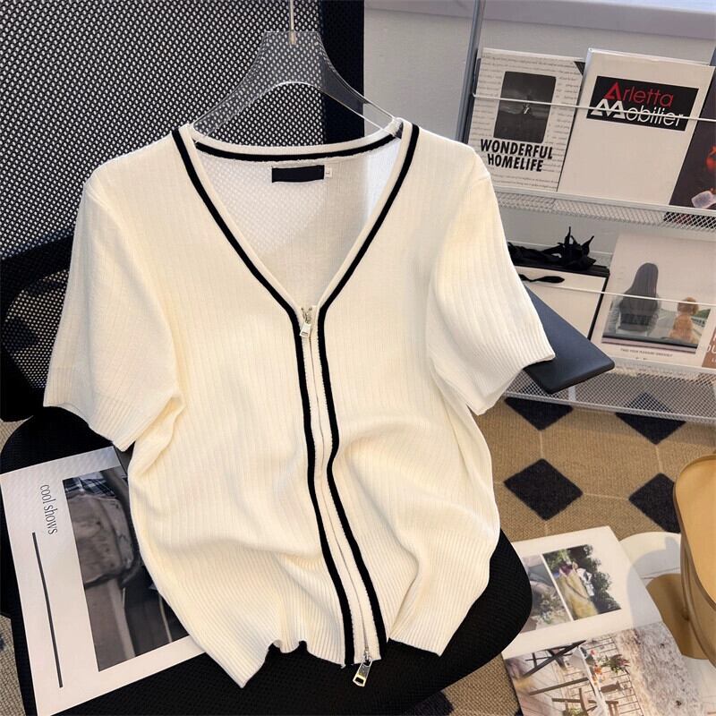 プラスサイズの女性の 2024 夏服太い新しい V ネックカラーブロックジッパー半袖薄いスリムフィットニットカーディガン 大きめサイズ サマー 夏物 Vネック 841S1624670194179
