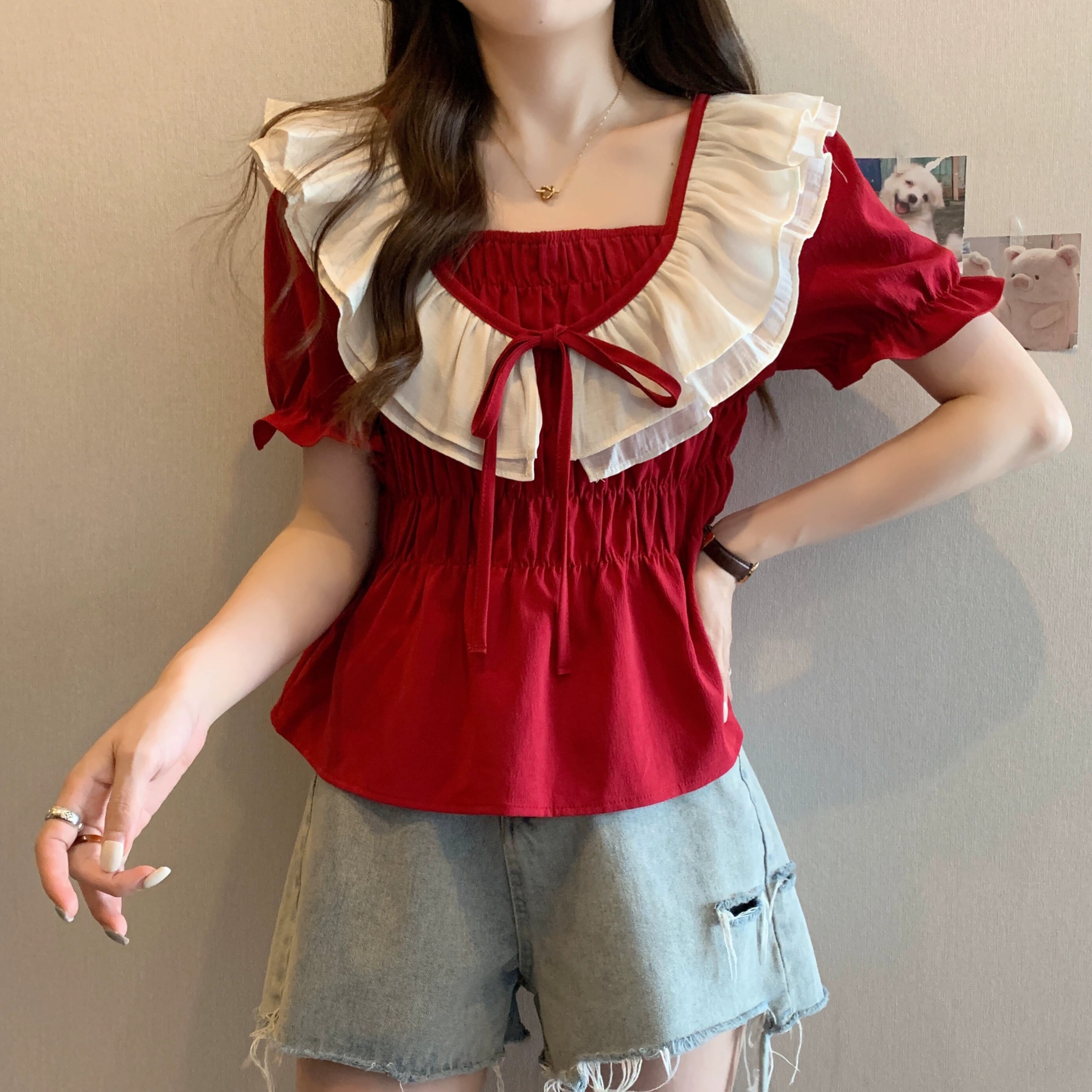 プラスサイズの女性の 2024 夏服脂肪パフスリーブコントラストカラースプライシング蓮の葉の襟シフォンシャツフランスの気質トップ 大きめサイズ サマー 夏物 841S1688802816783